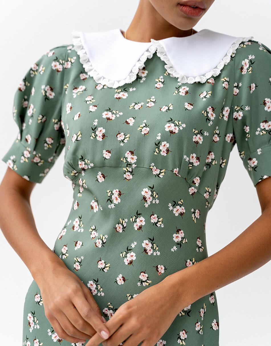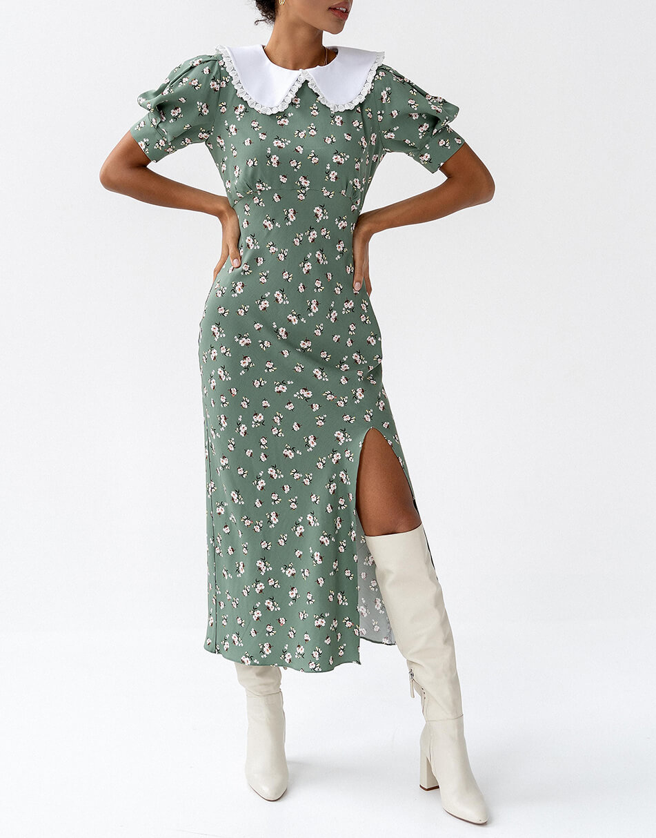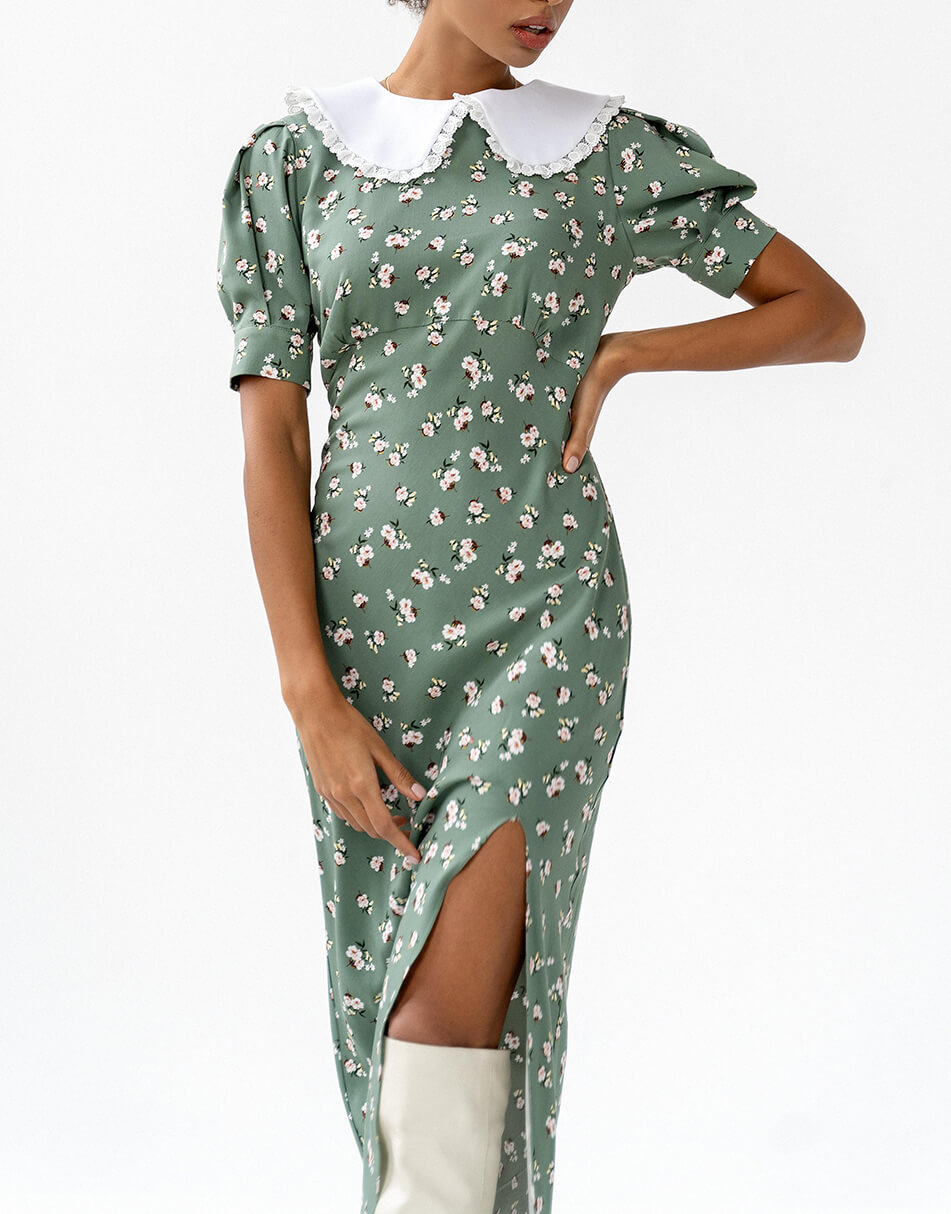 Силуетна сукня з рукавами-ліхтариками і знімним комірцем. Відрізна лінія з невеликими збірками під грудьми. Тканина віскоза з домішкою бавовни. Сукня виконана на підкладці і декорована розрізом по нозі. Застібається ззаду на потаємну блискавку.
