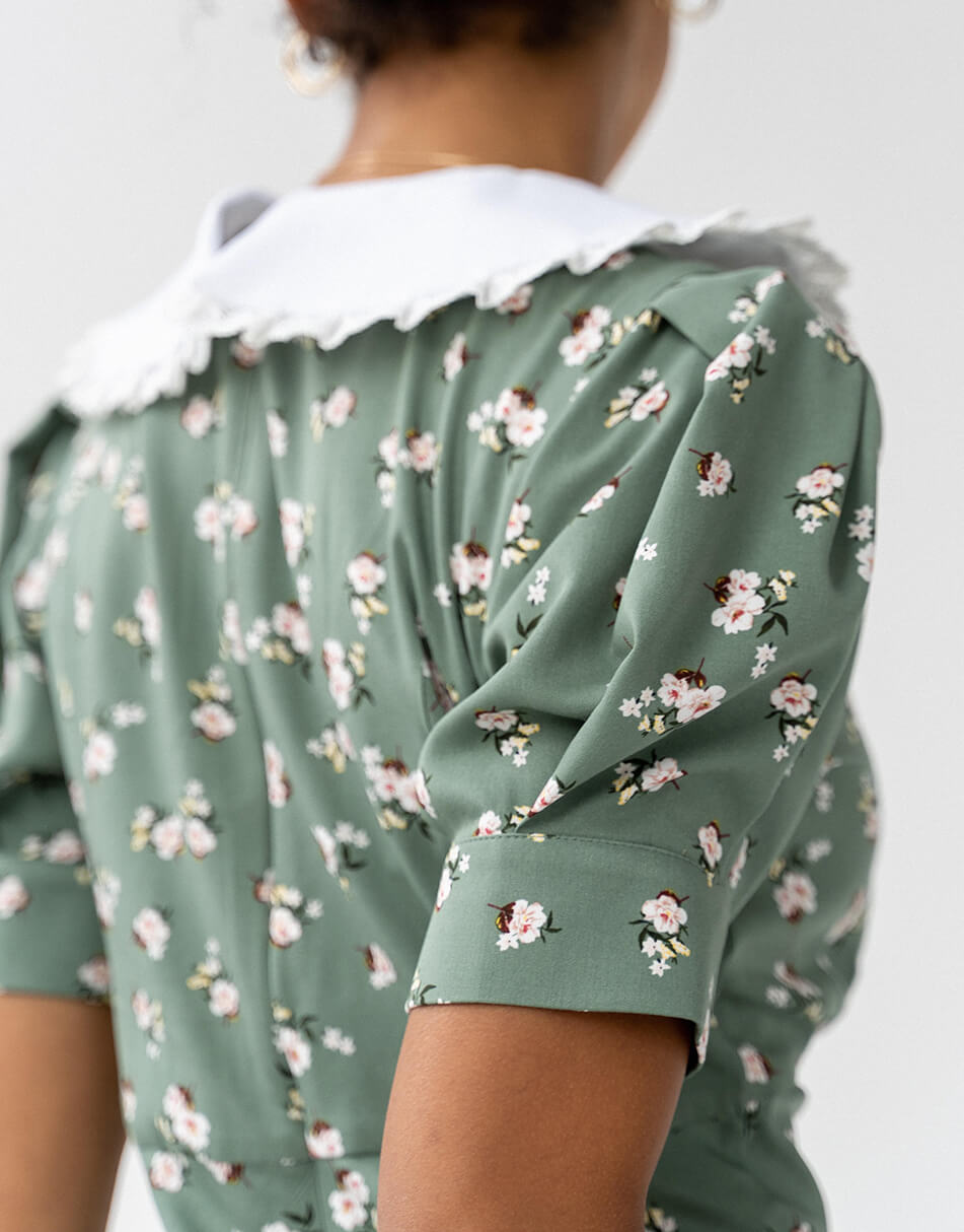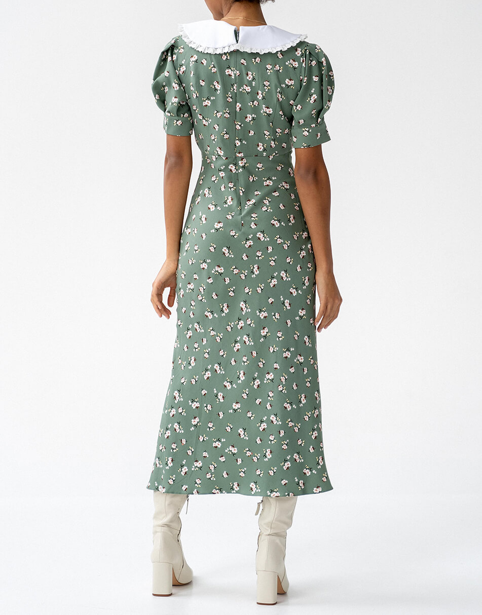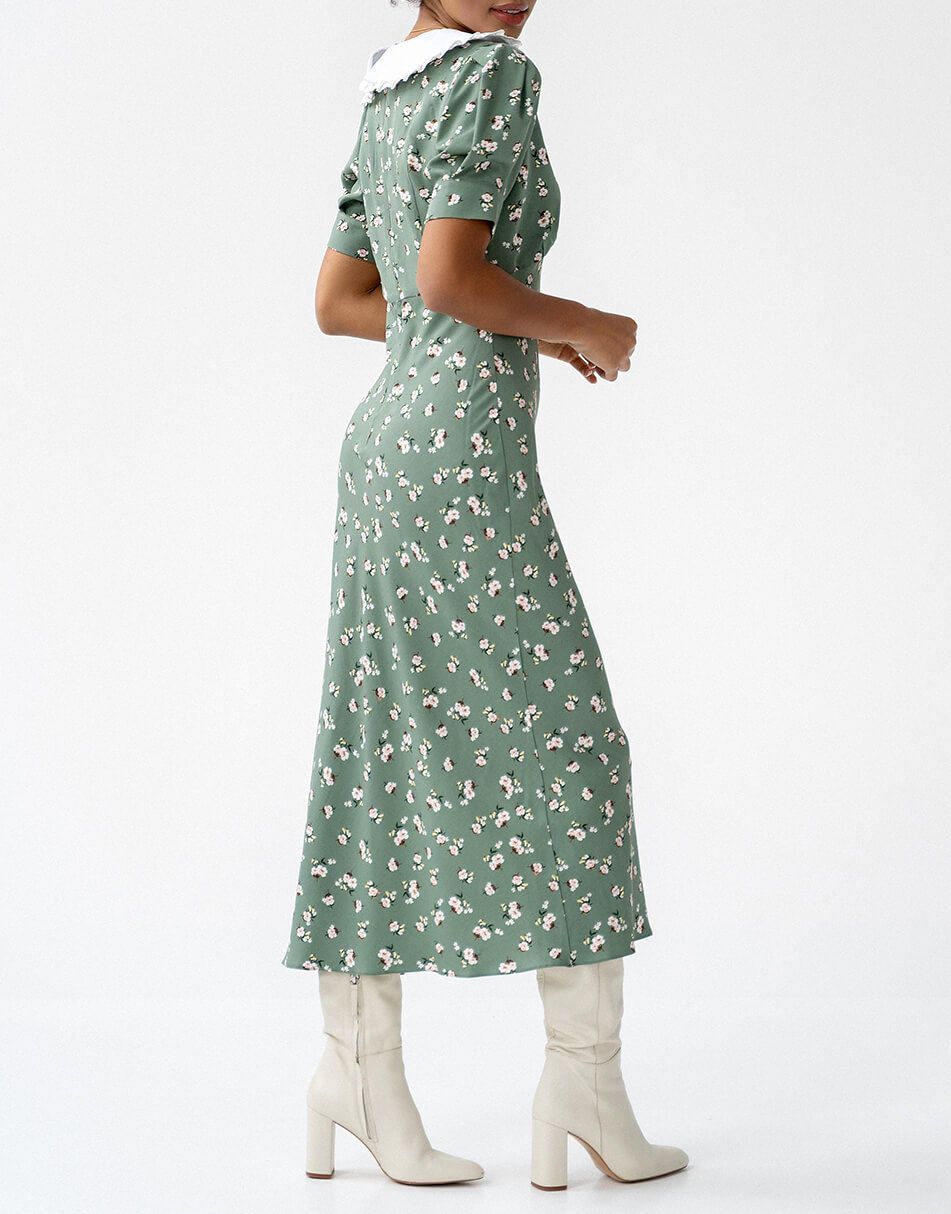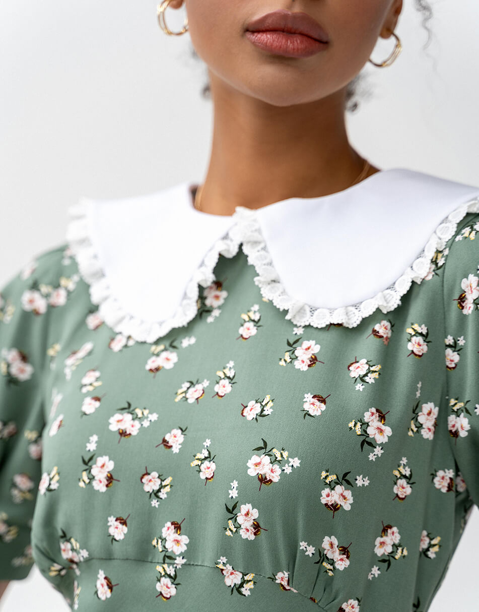 Силуетна сукня з рукавами-ліхтариками і знімним комірцем. Відрізна лінія з невеликими збірками під грудьми. Тканина віскоза з домішкою бавовни. Сукня виконана на підкладці і декорована розрізом по нозі. Застібається ззаду на потаємну блискавку.