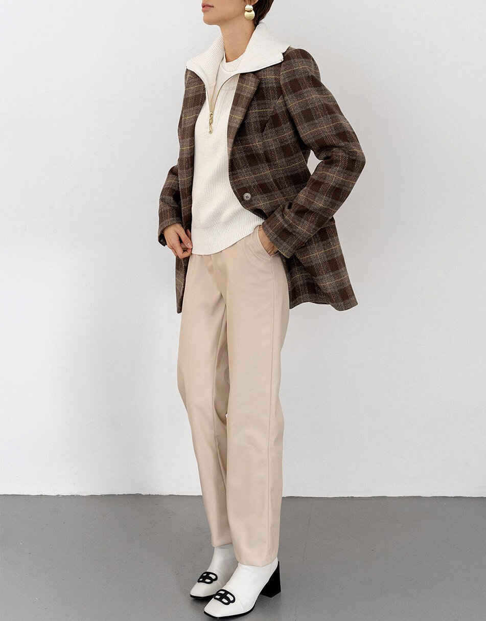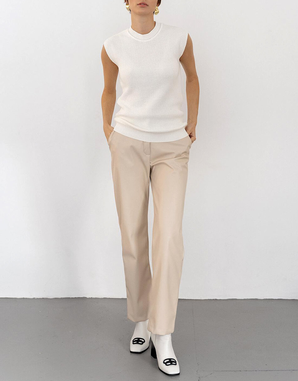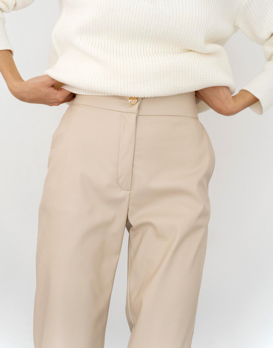 Прямі брюки з високою талією. М’яка еко-шкіра на флісі ідеально підійде для прохолодних днів. Також є кишені по боках. Застібаються спереду на брендовану кнопку та блискавку.