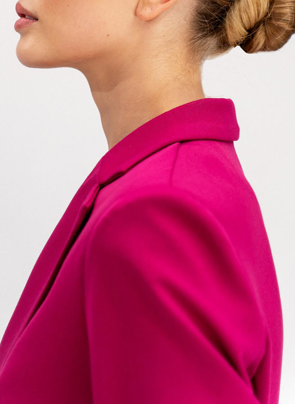 Силуетний, подовжений пиджак двобортного крою. Щільна тканина прекрасно тримає форму виробу. Оригінальний крій, функціональні кишені. Пиджак виконано на підкладці. Довжина виробу 70 см.