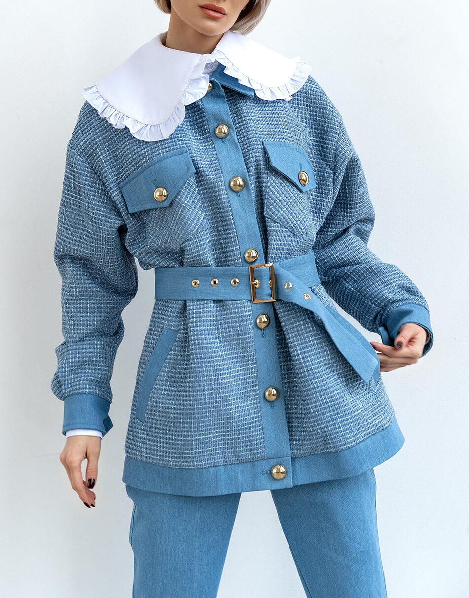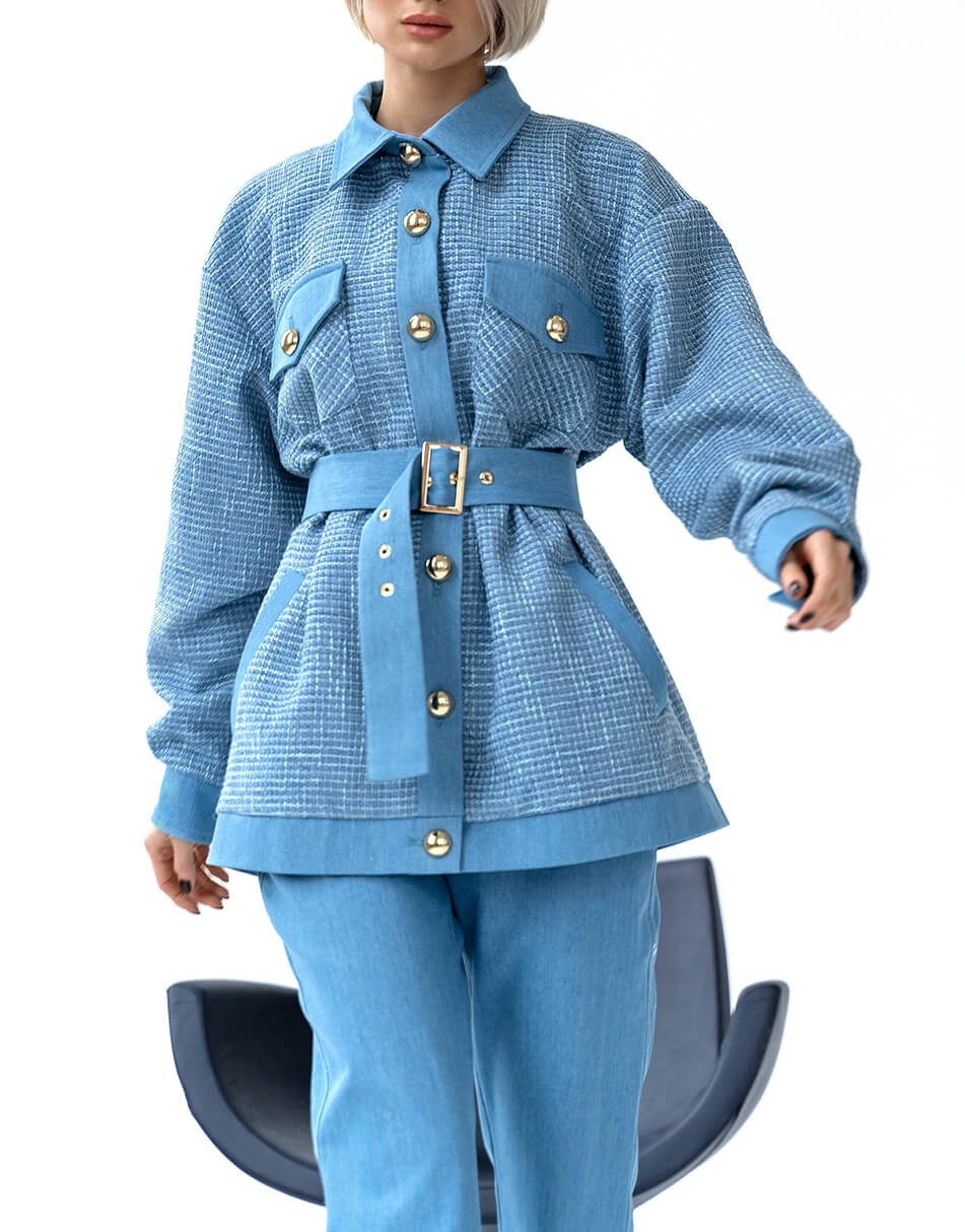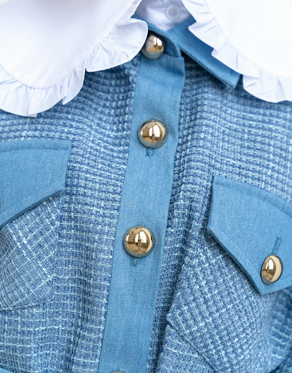 Стильна куртка-сорочка виконана в поєднанні 2 типів тканин: джинс і твід. Курточка виконана на підкладці, застібається на красиві ґудзики і декорована накладними кишенями.
