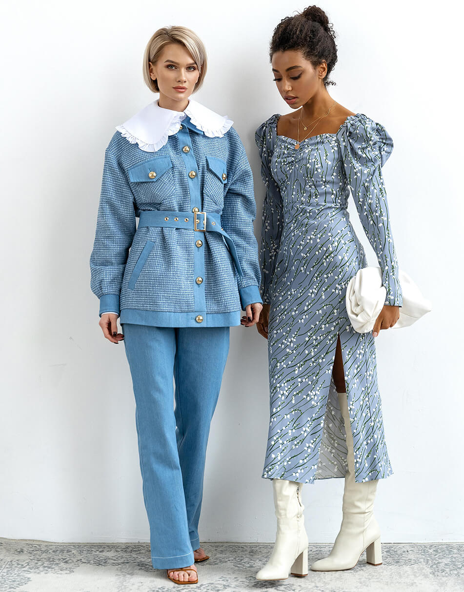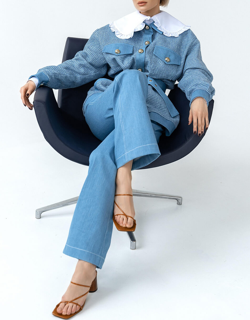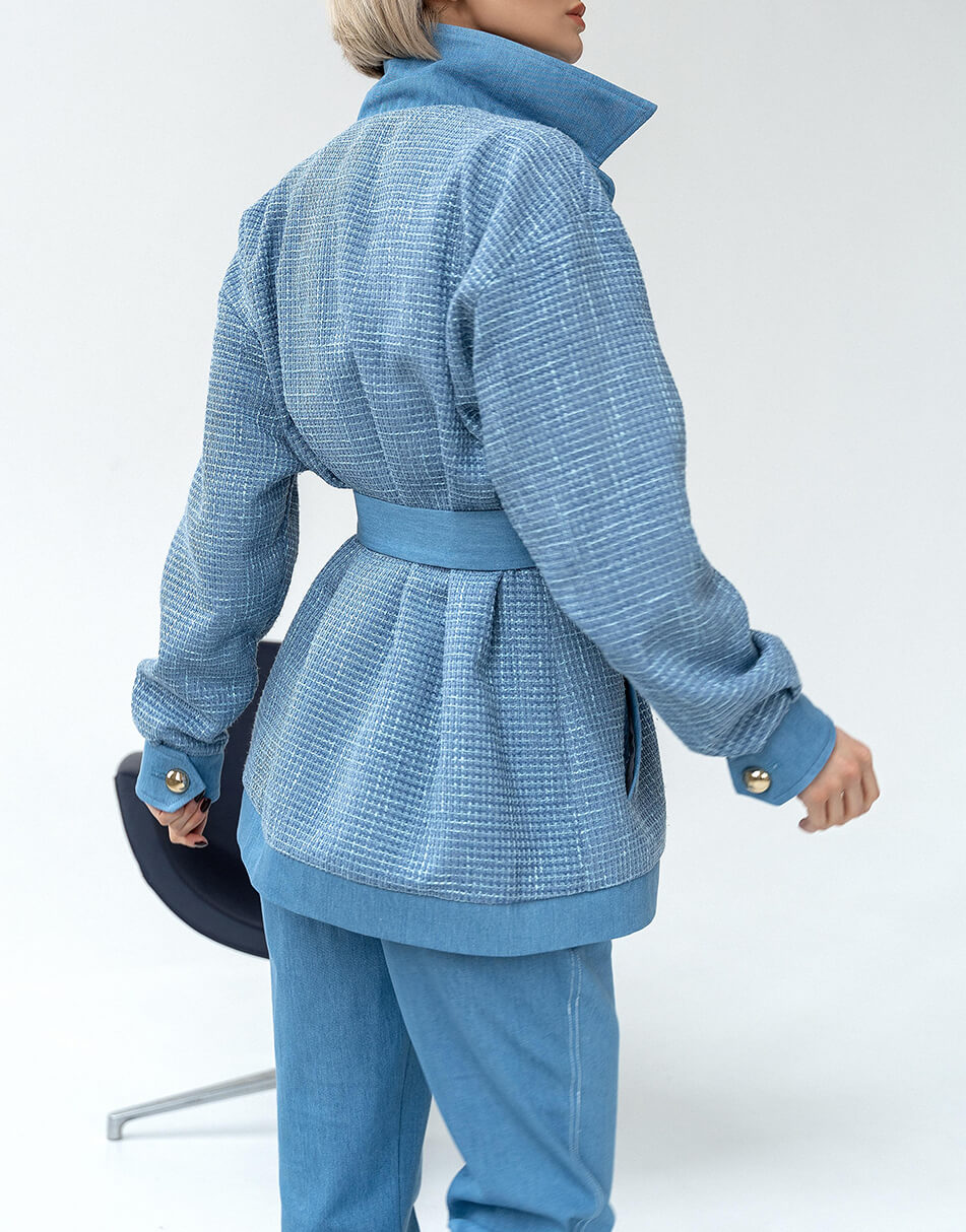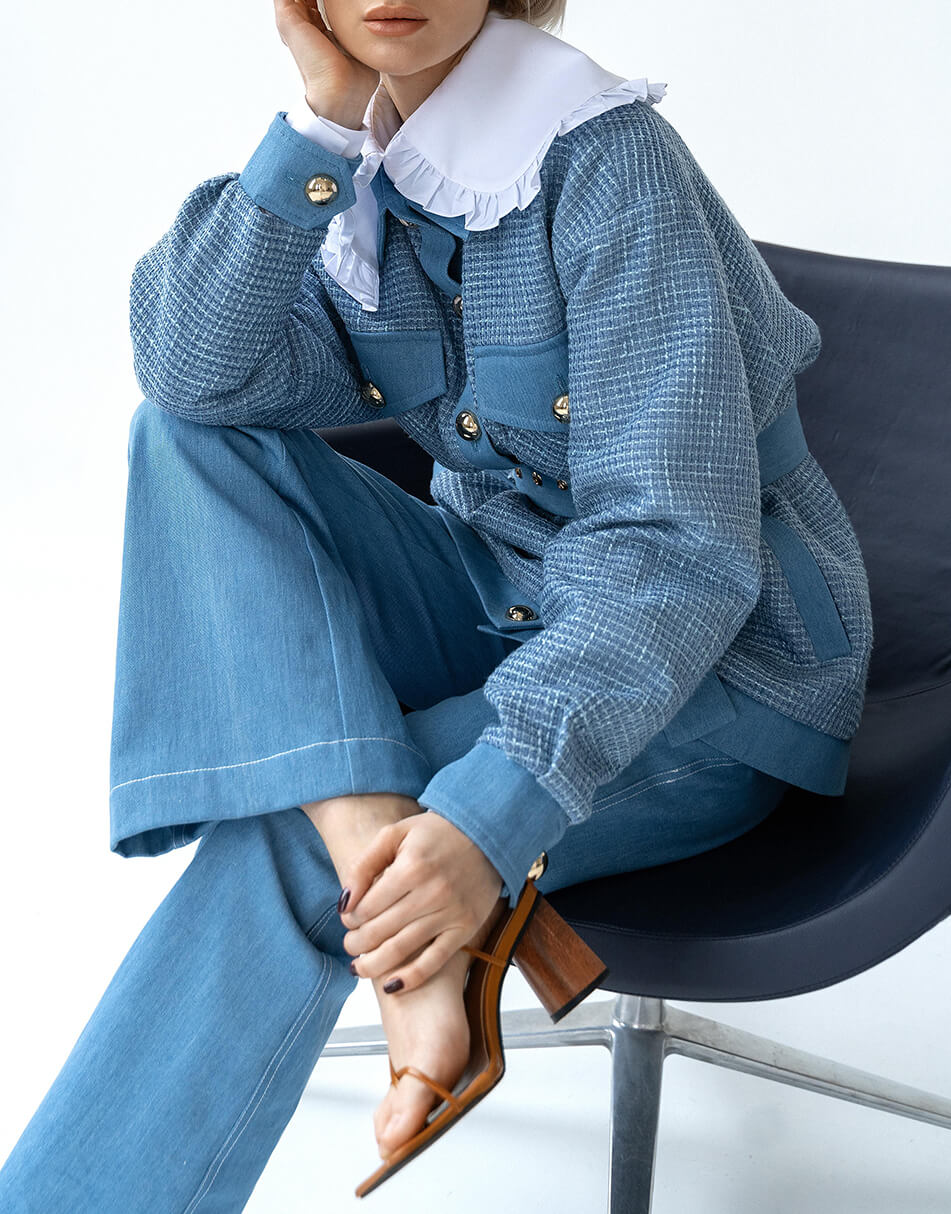 Стильна куртка-сорочка виконана в поєднанні 2 типів тканин: джинс і твід. Курточка виконана на підкладці, застібається на красиві ґудзики і декорована накладними кишенями.