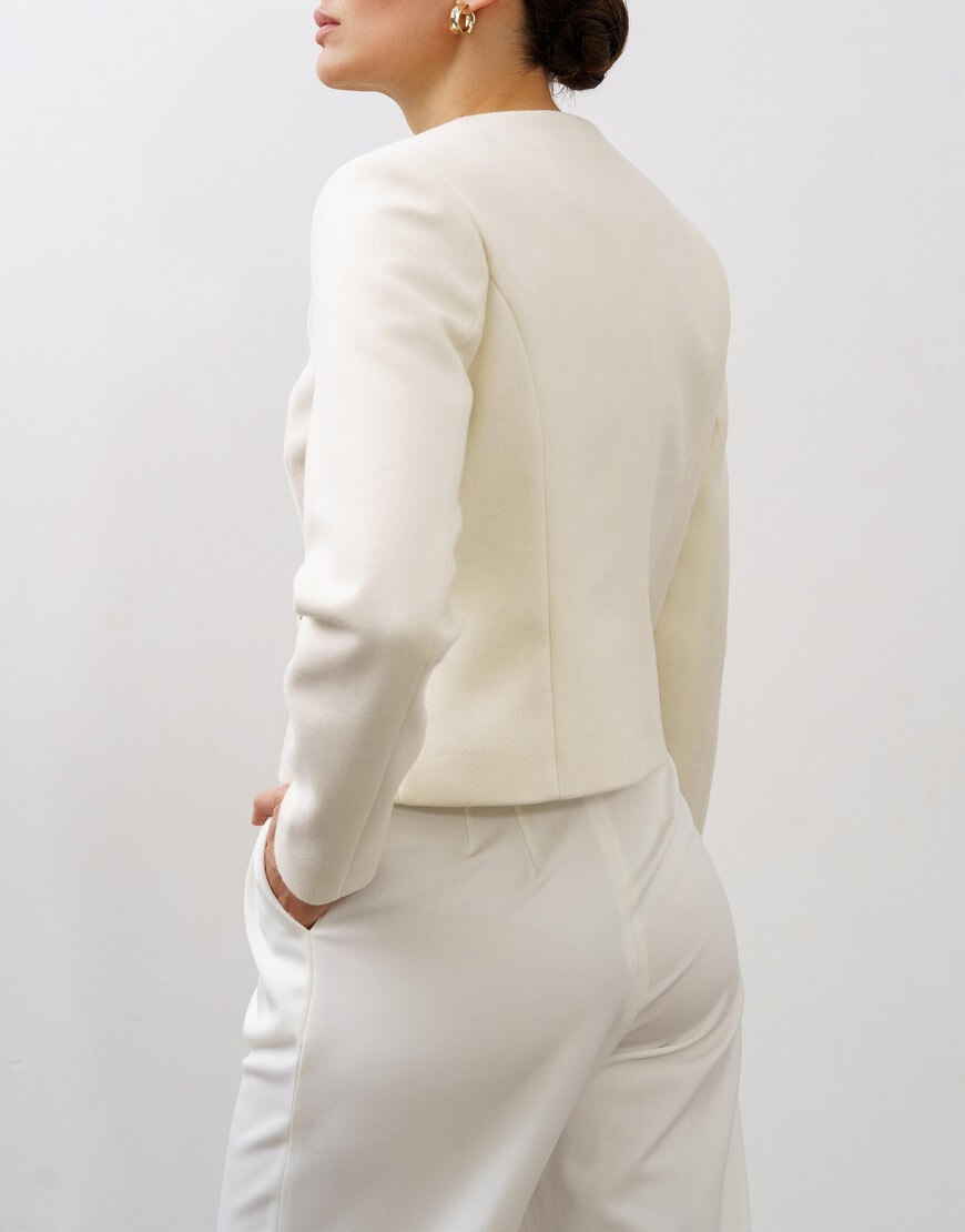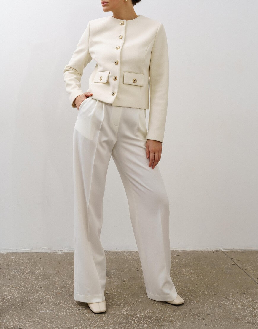 Штани-палаццо з подвійними защипами та кишенями по боках. Висока лінія талії та широкий пояс підкреслюють силует. Широкий манжет по низу штанів.