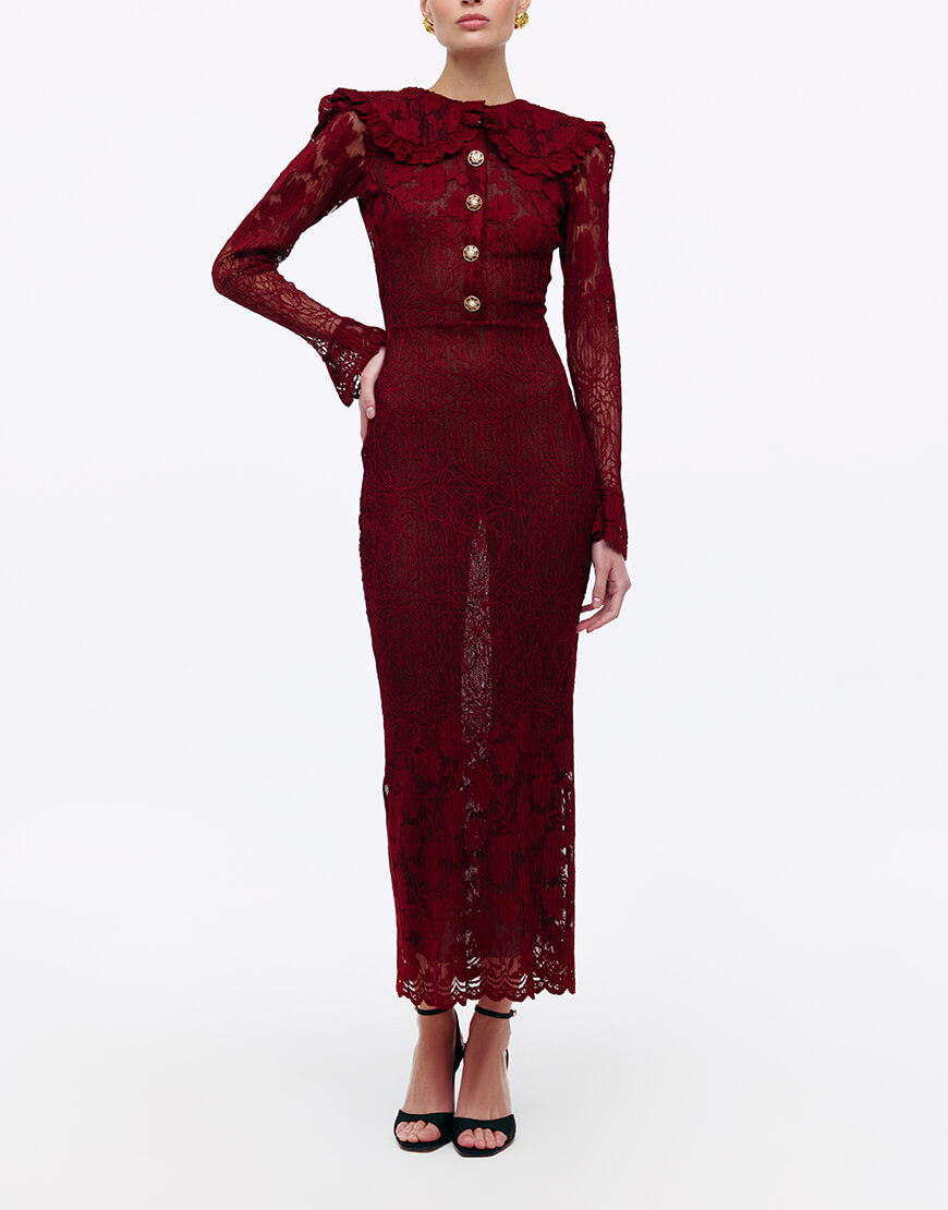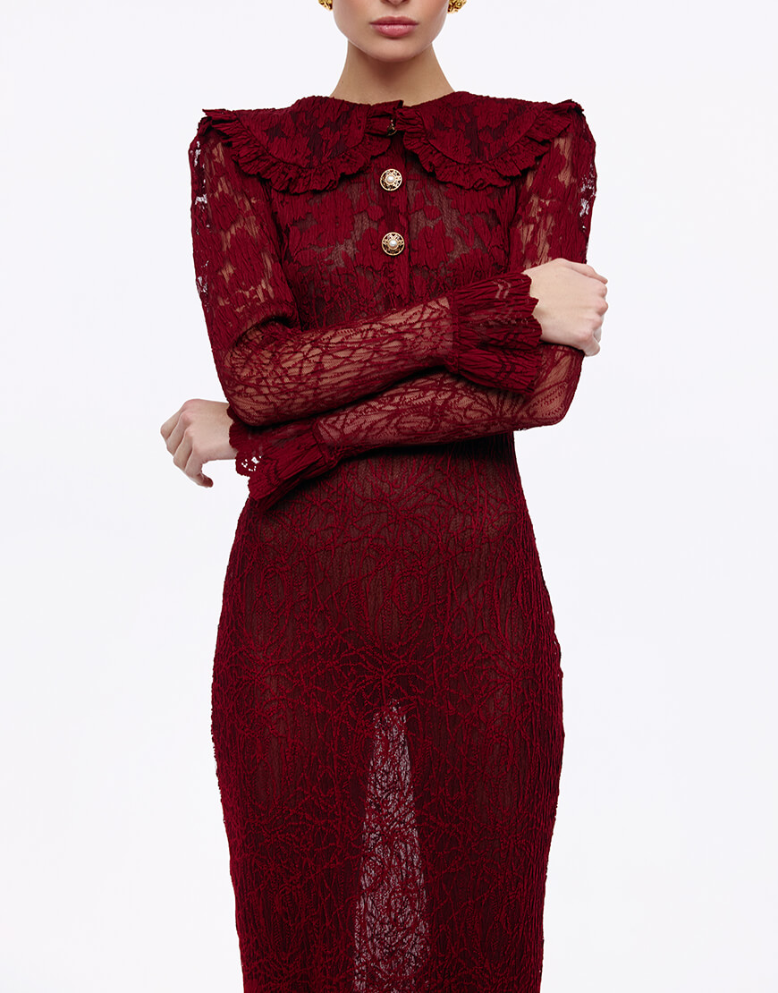 Доставка впродовж 2-10 робочих днівСилуетна сукня з еластичного мережива та акцентним комірцем. Сукня міді довжини та виконана на сітчастій підкладці, застібається на потаємну блискавку по спинці. Спереду сукня декорована ґудзиками.