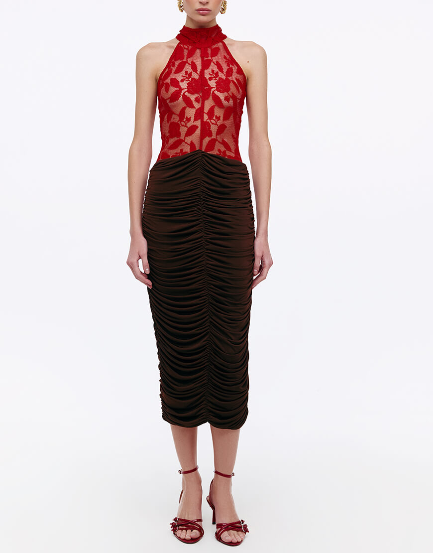 Силуетна сукня з еластичної та приємної на дотик тканини, з спідниці. Сукня міді довжини та виконана на підкладці, застібається на потаємну блискавку по спинці.