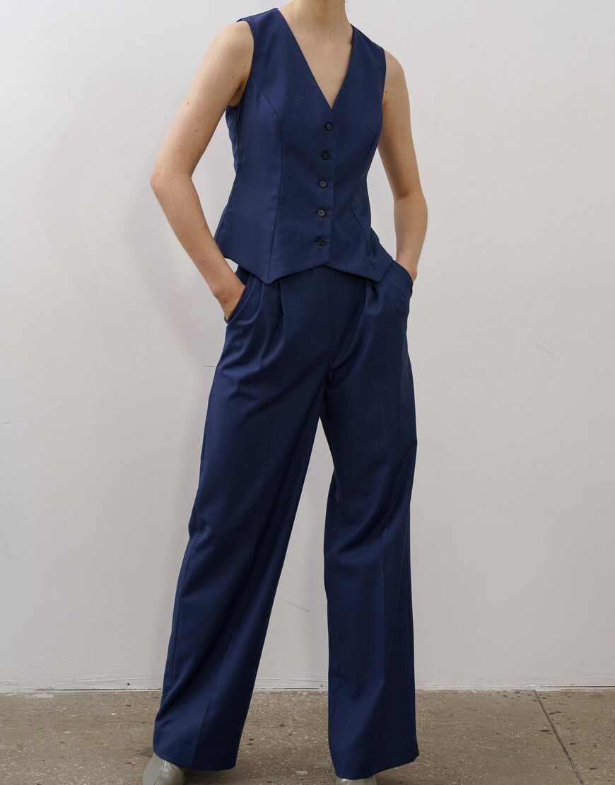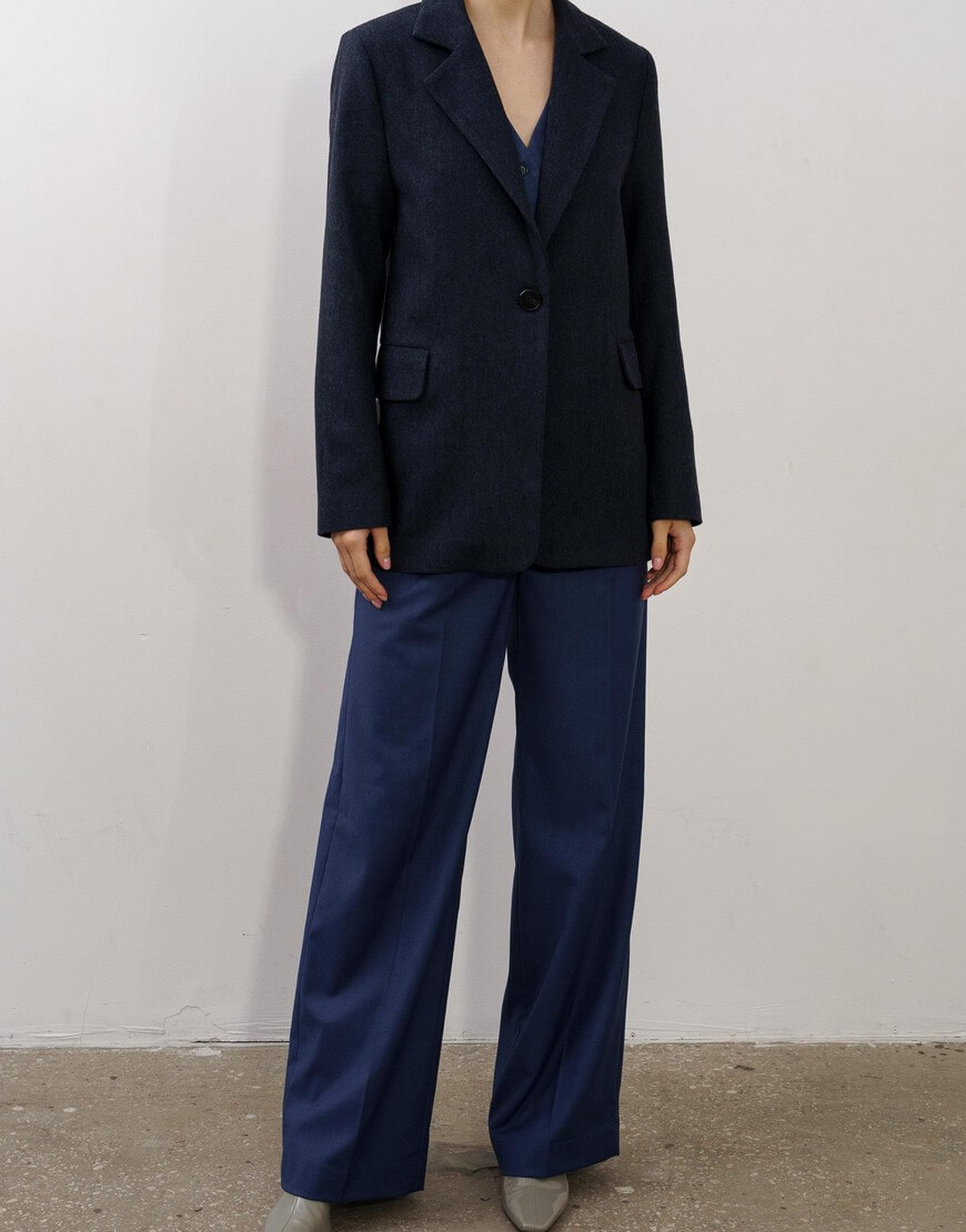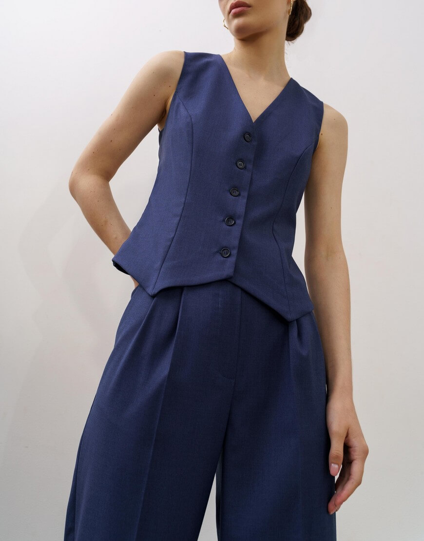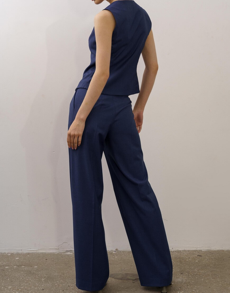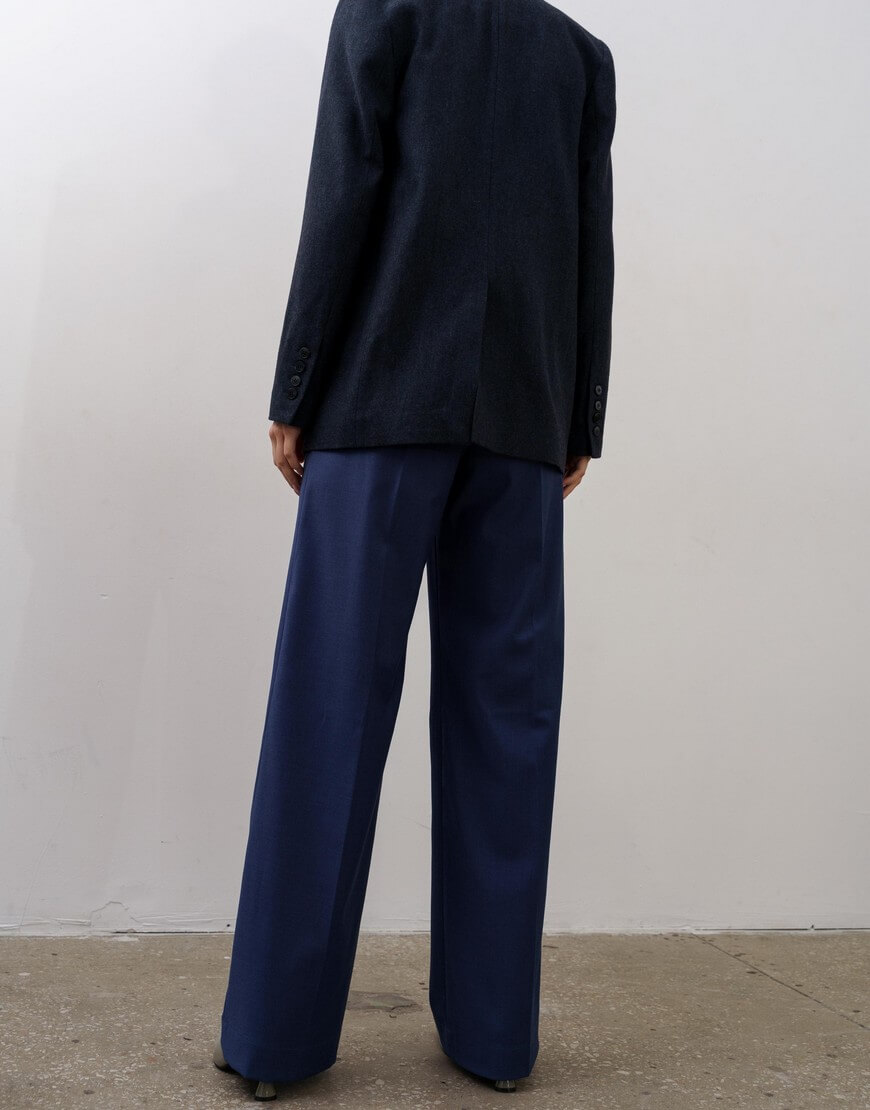 Штани-палаццо з подвійними защипами та кишенями по боках. Висока лінія талії та широкий пояс підкреслюють силует. Широкий манжет по низу штанів.