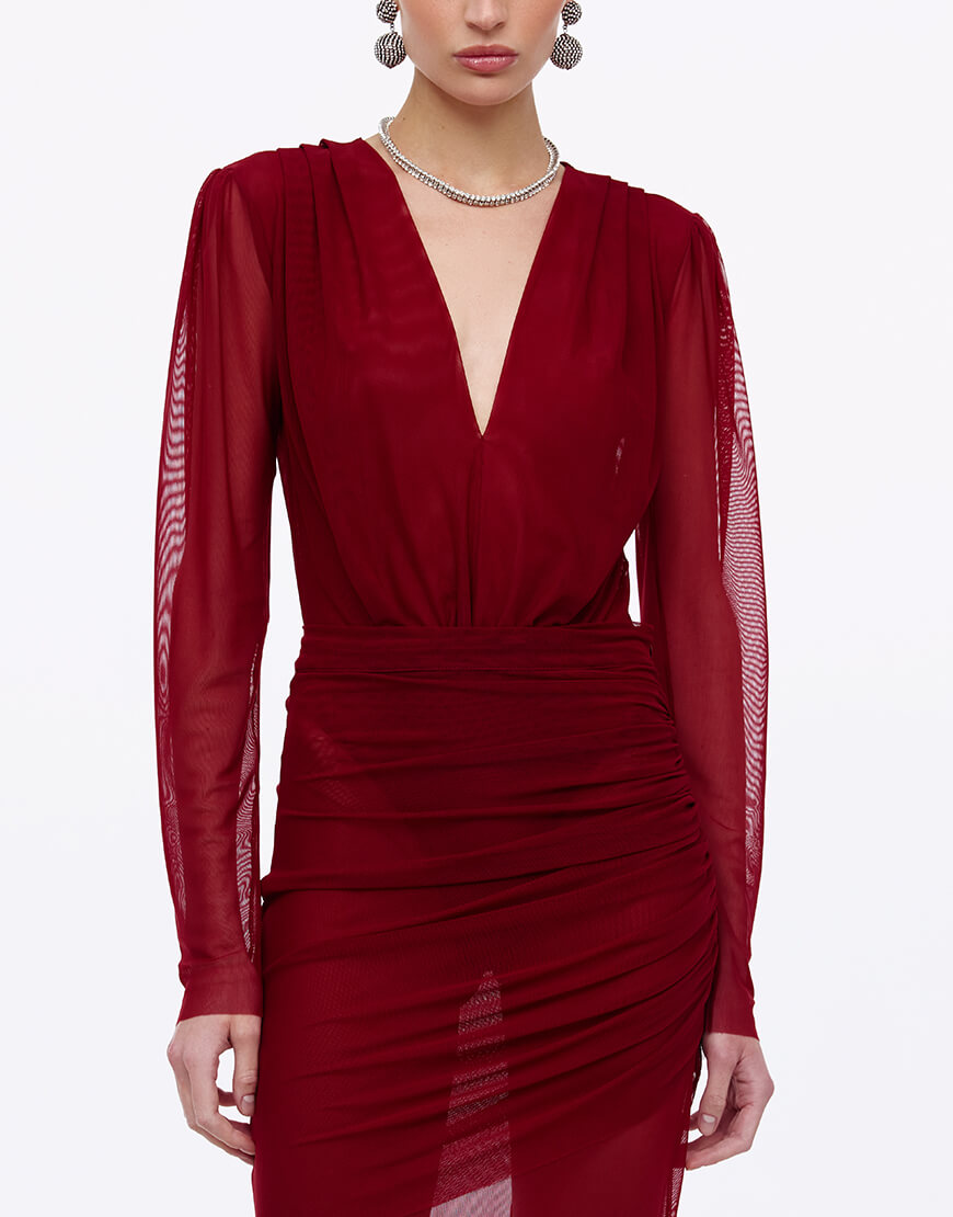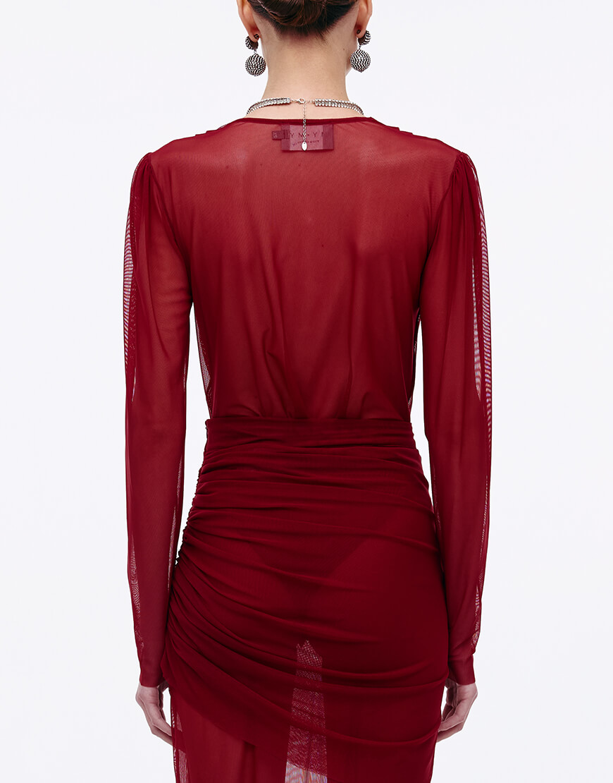 Боді з сітки бордового кольору, виконаний на підкладці підкладки з акцентним драпіруванням по переду.