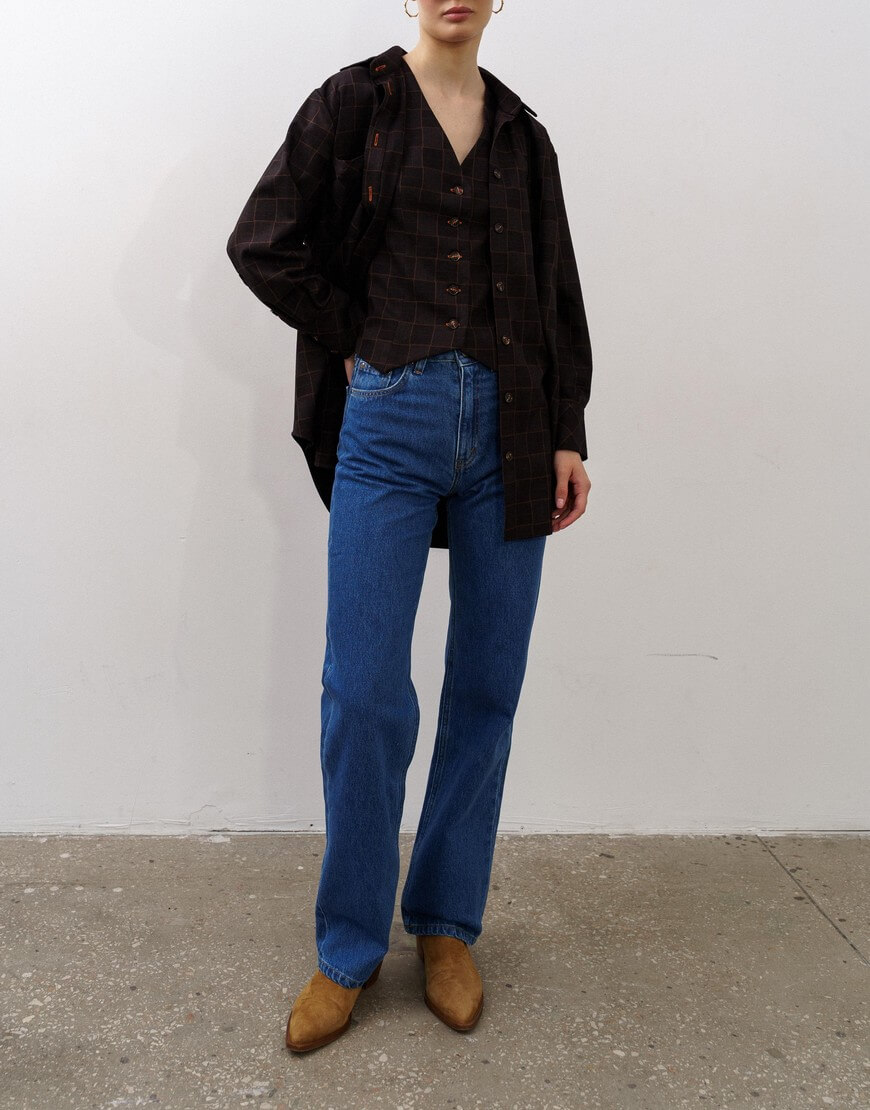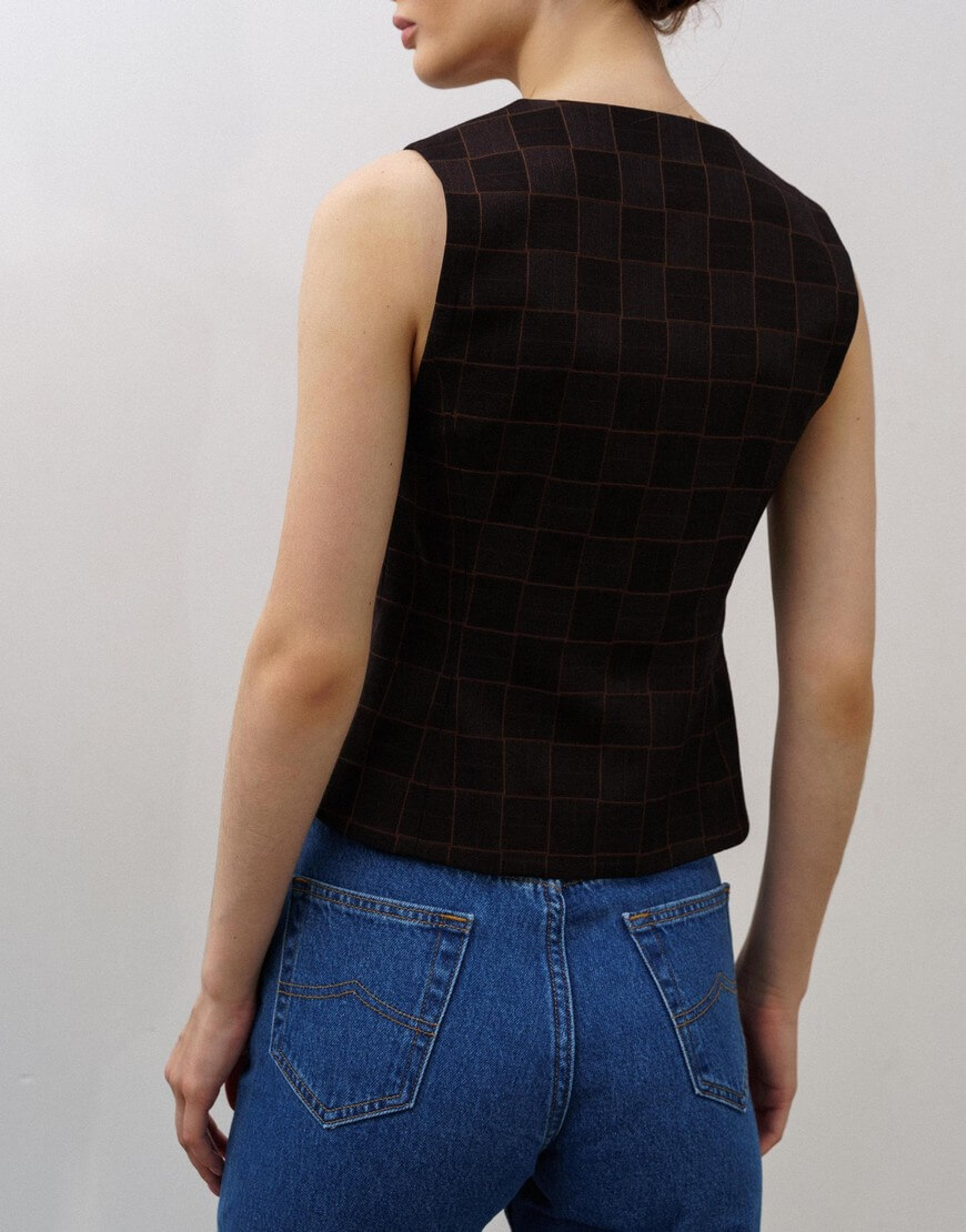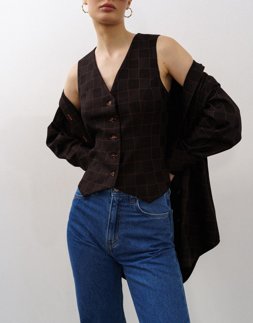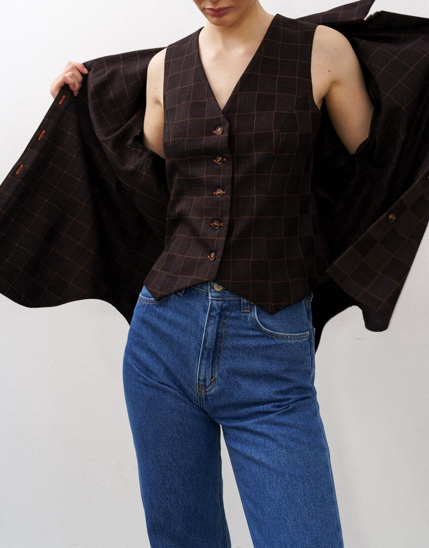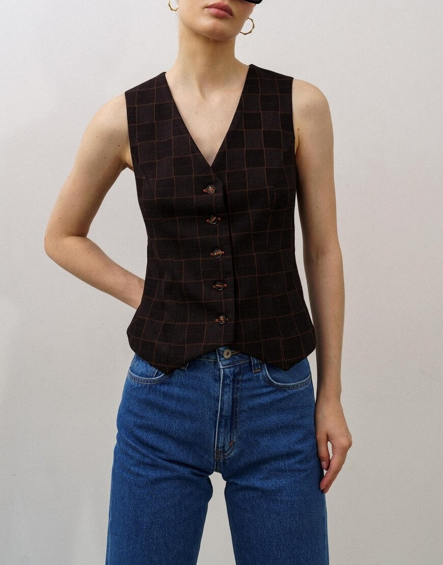 Костюмний жилет з тонкої вовни, виконаний на підкладці. Силуетний, приталений крій. Застібається спереду на гудзики.