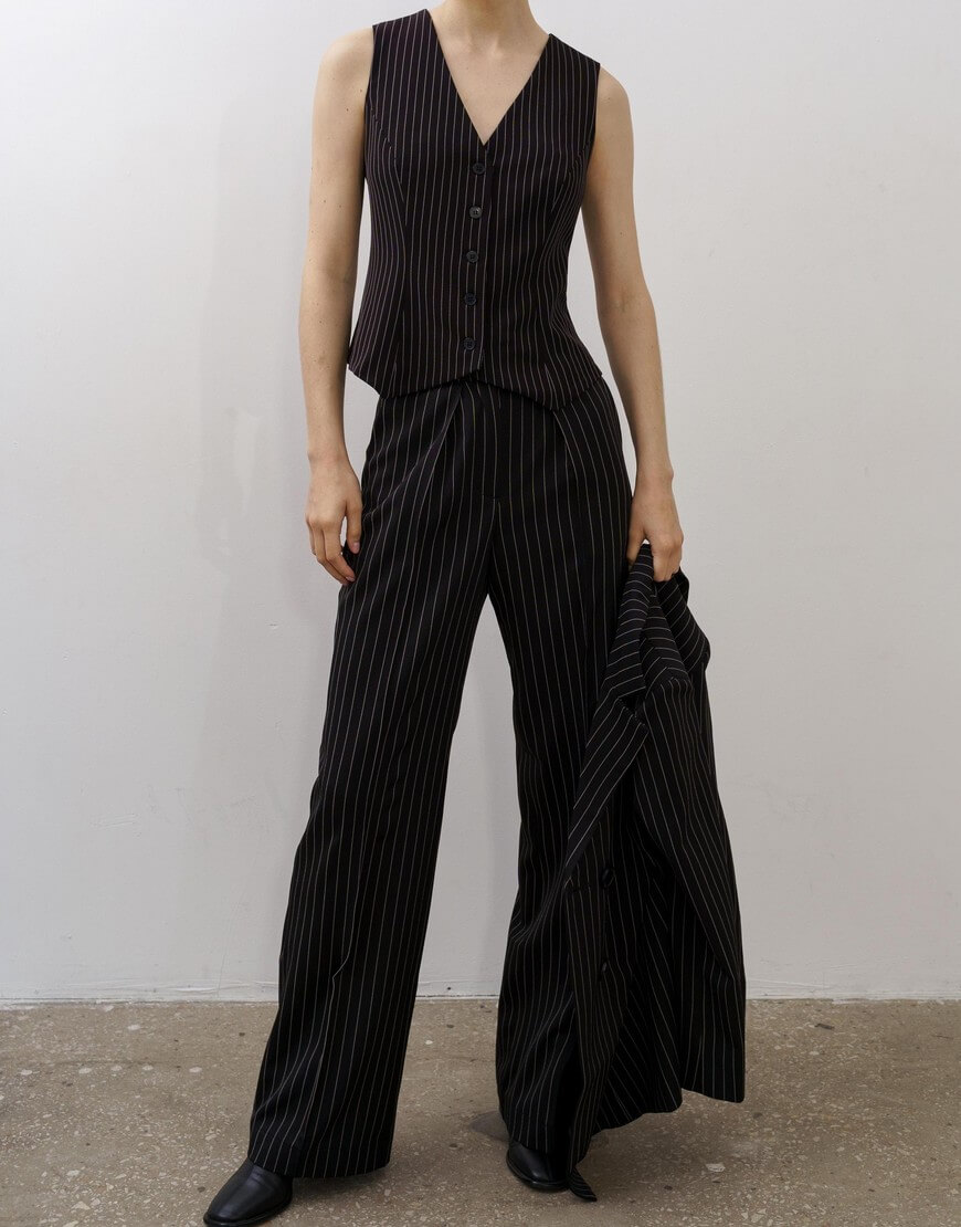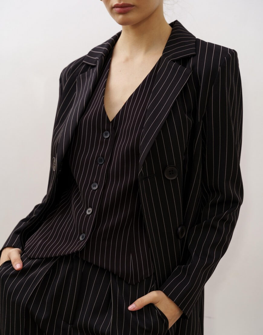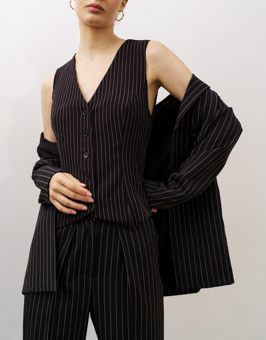 Костюмний жилет з тонкої вовни, виконаний на підкладці. Силуетний, приталений крій. Застібається спереду на гудзики.