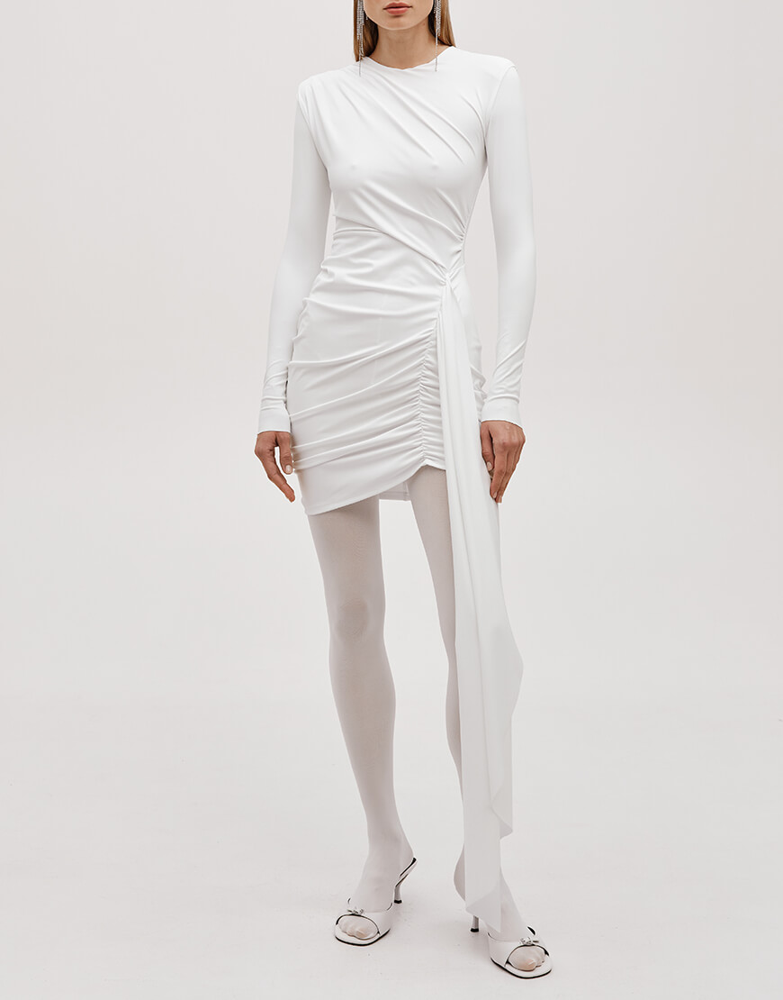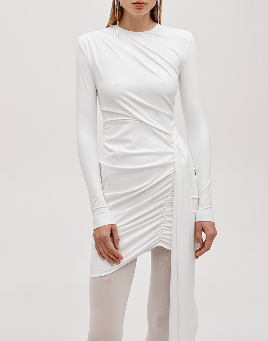 Силуетна сукня з еластичної щільної тканини та драпіюванням. Сукня міні довжини та виконана на підкладці до лінії талії, застібається на потаємну блискавку по спинці.