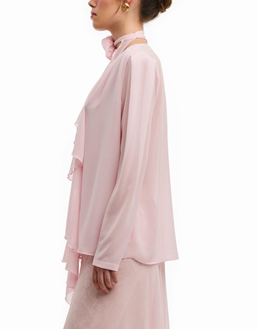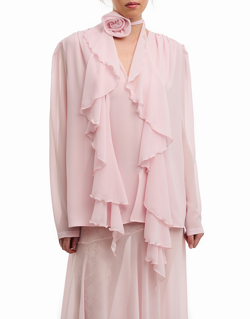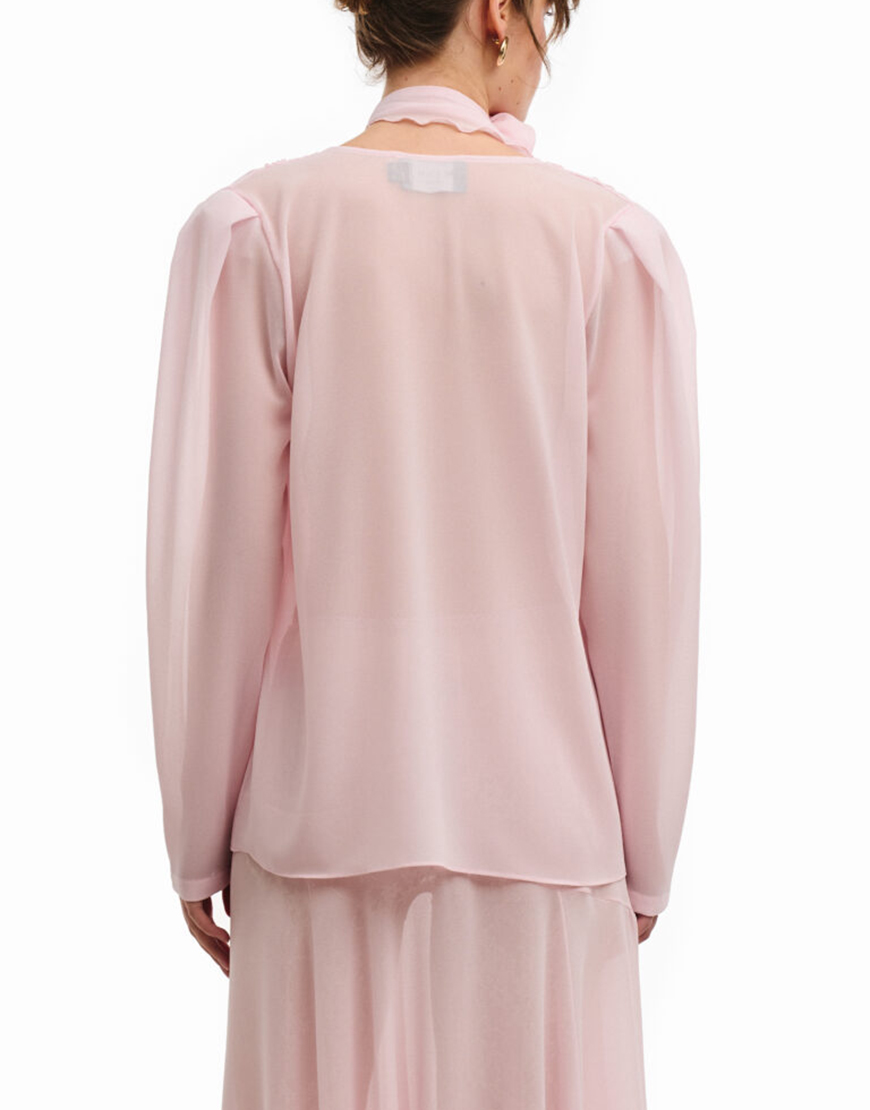 Шифонова блуза об’ємного крою. Рукава-ліхтарики та глибокий виріз надають витонченості силуету. Спереду блуза виконана на підкладці. В комплекті чокер-хустинка.