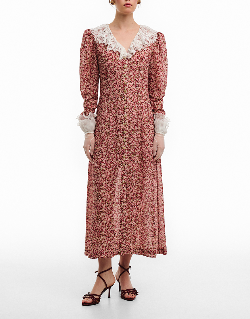 Доставка від 14 днівСукня-міді з розкішного віскозного шифону. Сукня виконана на підкладці. Рукава-ліхтарики створюють додатковий об’єм. Білий комірець із мережива, надає сукні особливої витонченості. Сукня застібається спереду на контрастні білі гудзики. Преміальна технологія виконання з усіма закритими швами. Довжина сукні 128 см.