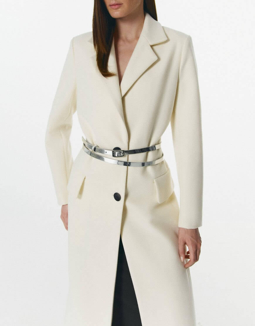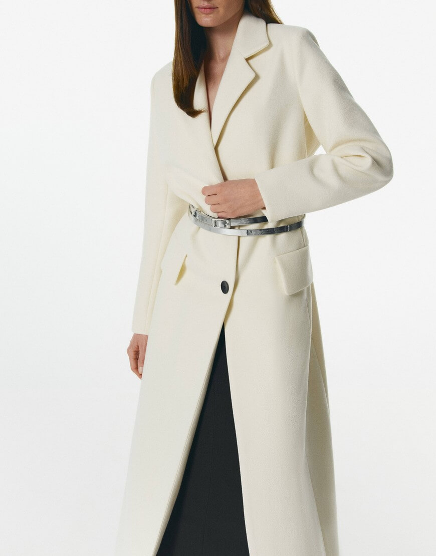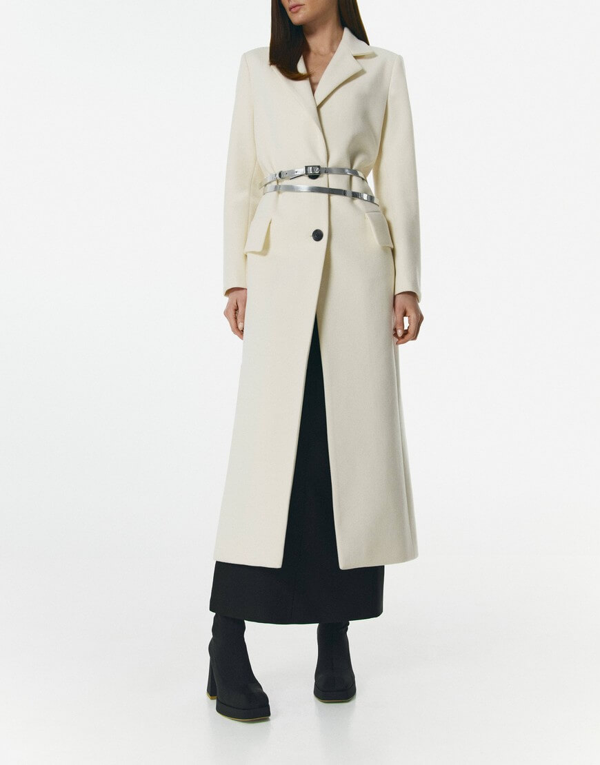 Об’ємне, однобортне пальто, прямого крою зі змішаної вовняної тканини. Бездогано тримає форму. Виконано на підкладці. Застібається спереду на гудзики. Щільна, фактурна тканина. Пальто виконано у 2 суміжних розмірах: XS-S, M-L.