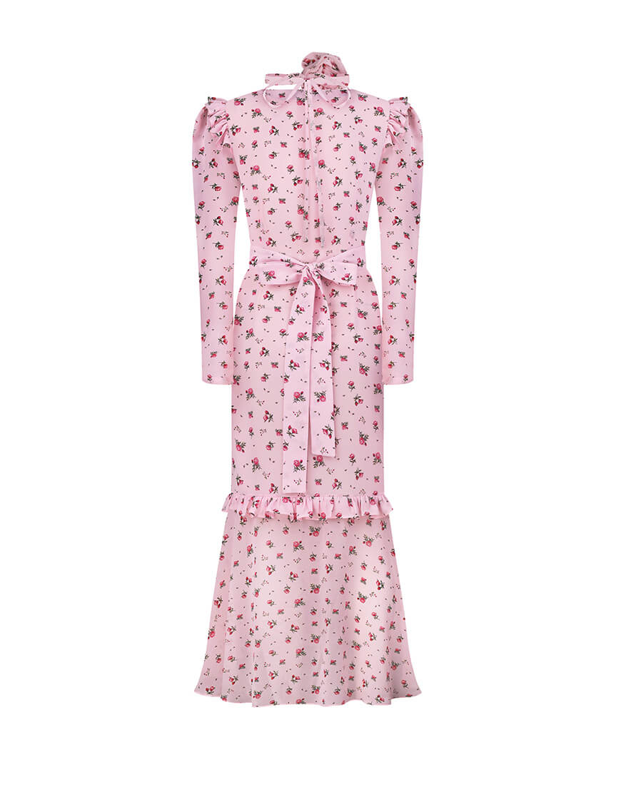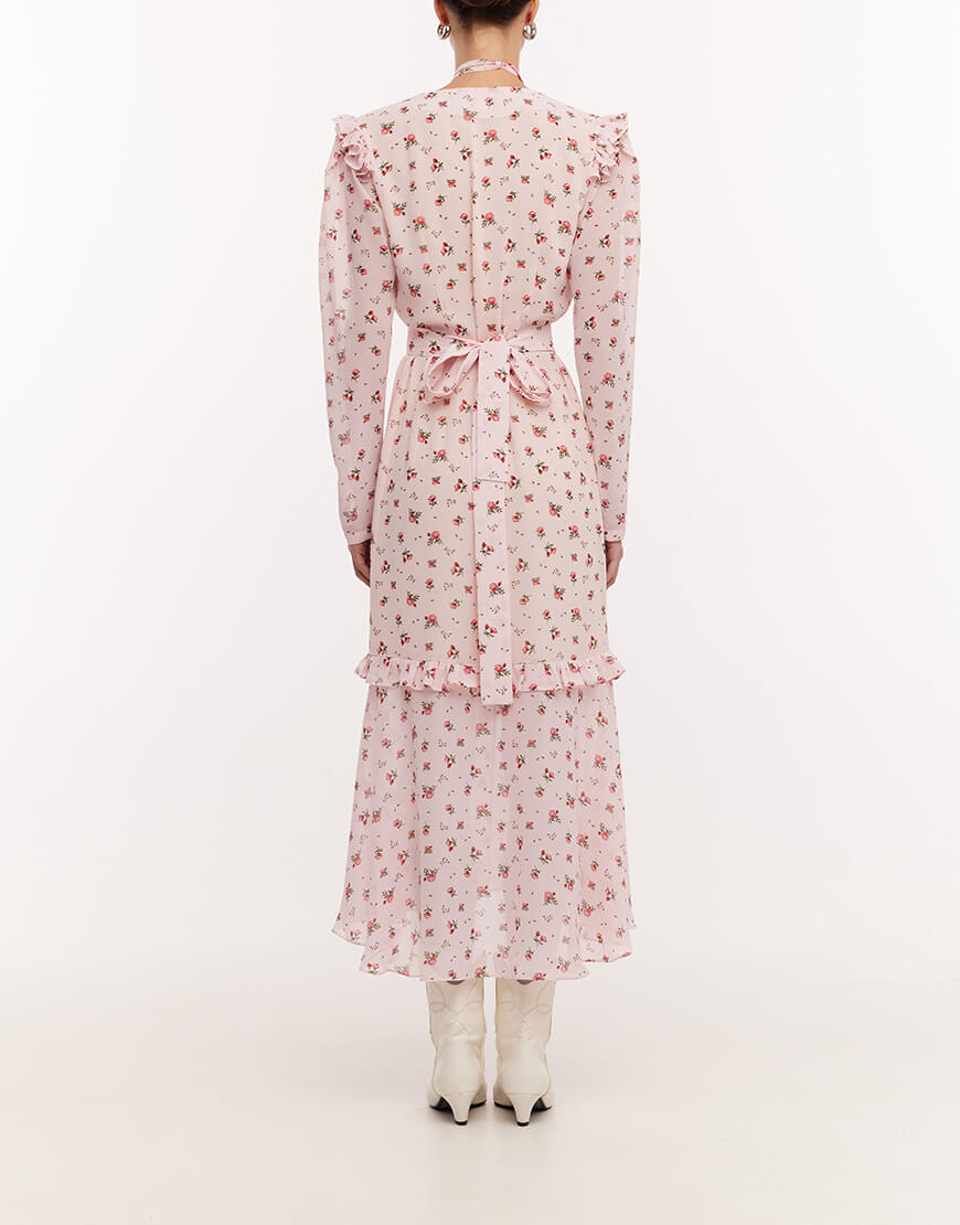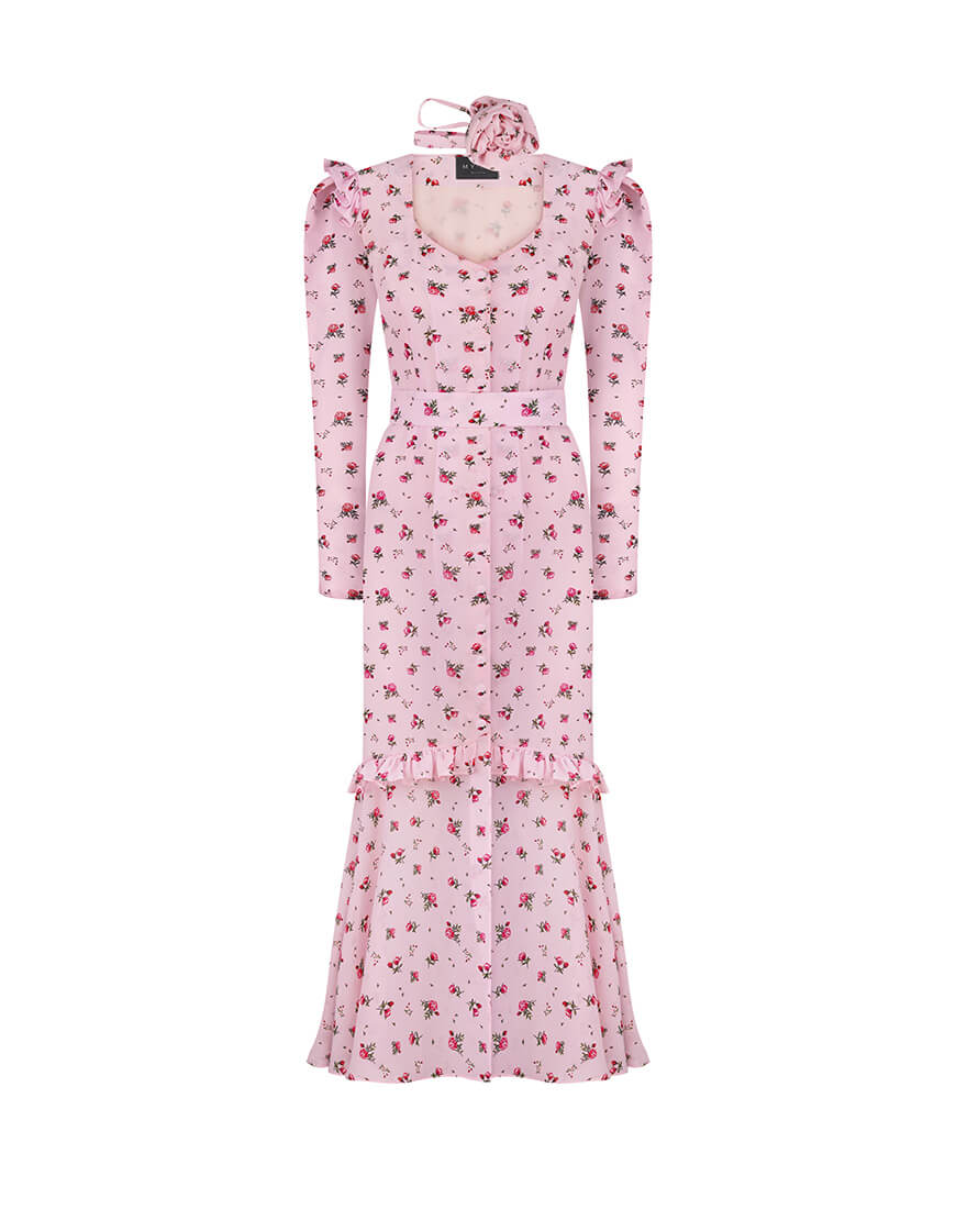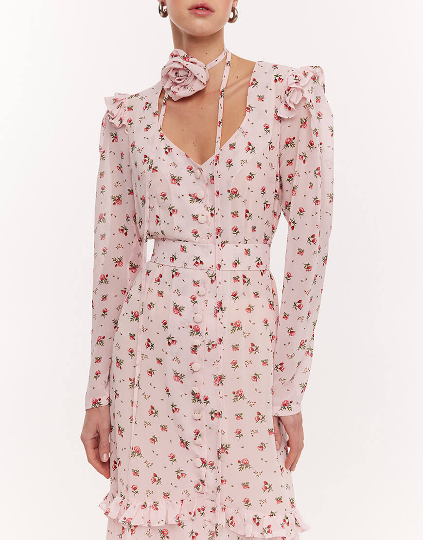 Сукня-міді з розкішного віскозного шифону. Сукня виконана на підкладці. Рукава-ліхтарики та волани створюють додатковий об’єм. Фігурний виріз по ліфу надає сукні особливої витонченості. Пояс та чокер у вигляді троянди в комплекті. Довжина сукні 128 см.