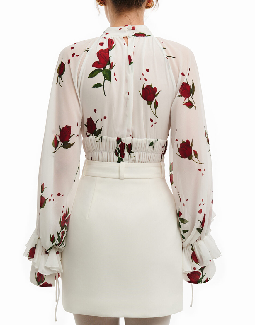 Доставка від 14 днівБлуза з розкішного віскозного шифону у авторському принті, створеному спеціально для нової колекції. Об’ємні рукава з широкими манжетами та воланами. Фігурні вирізи з драпіруваннями по ліфу та талії надають блузі особливої витонченості. Лінія талії виконана на резинці. Горловина блузи декорована квітами ручної роботи. Преміальна технологія виконання з усіма закритими швами.