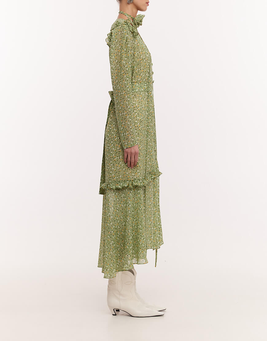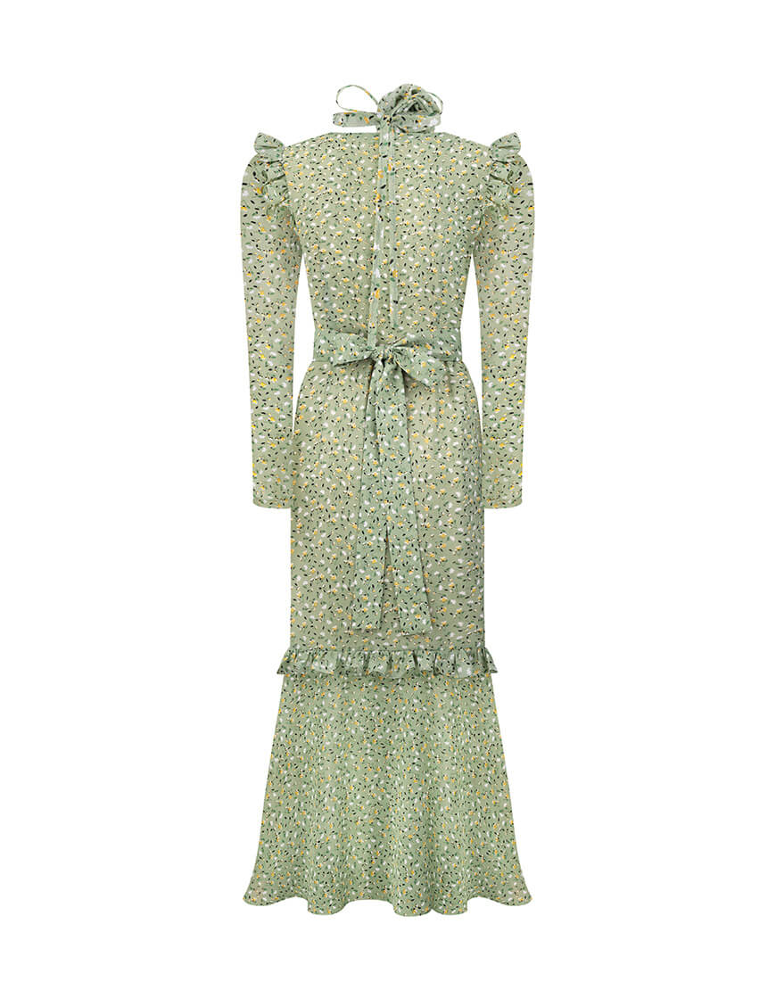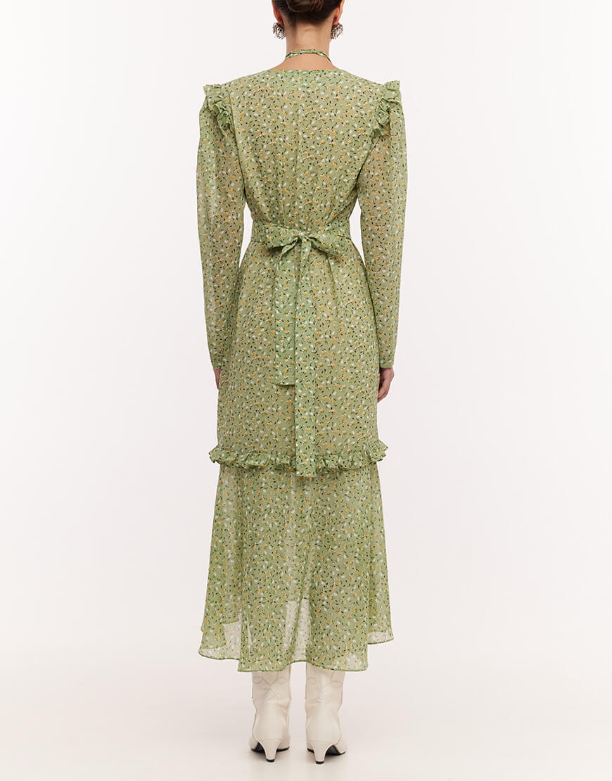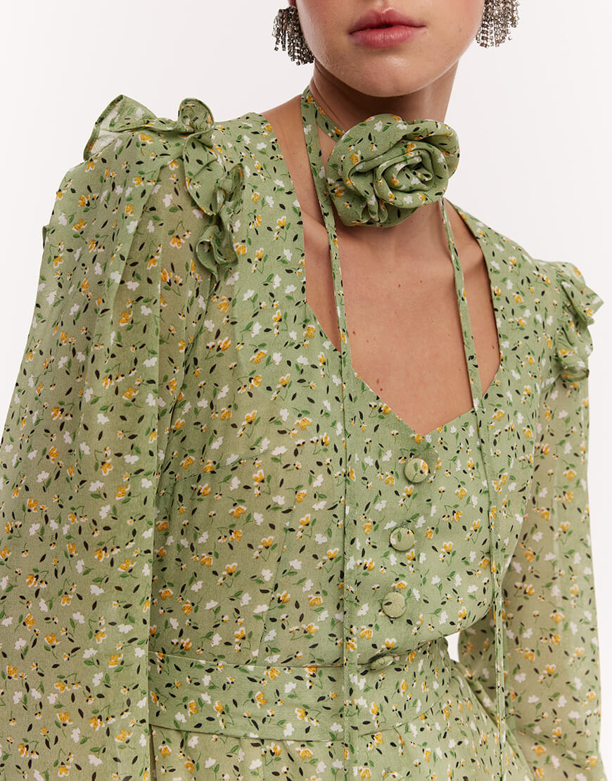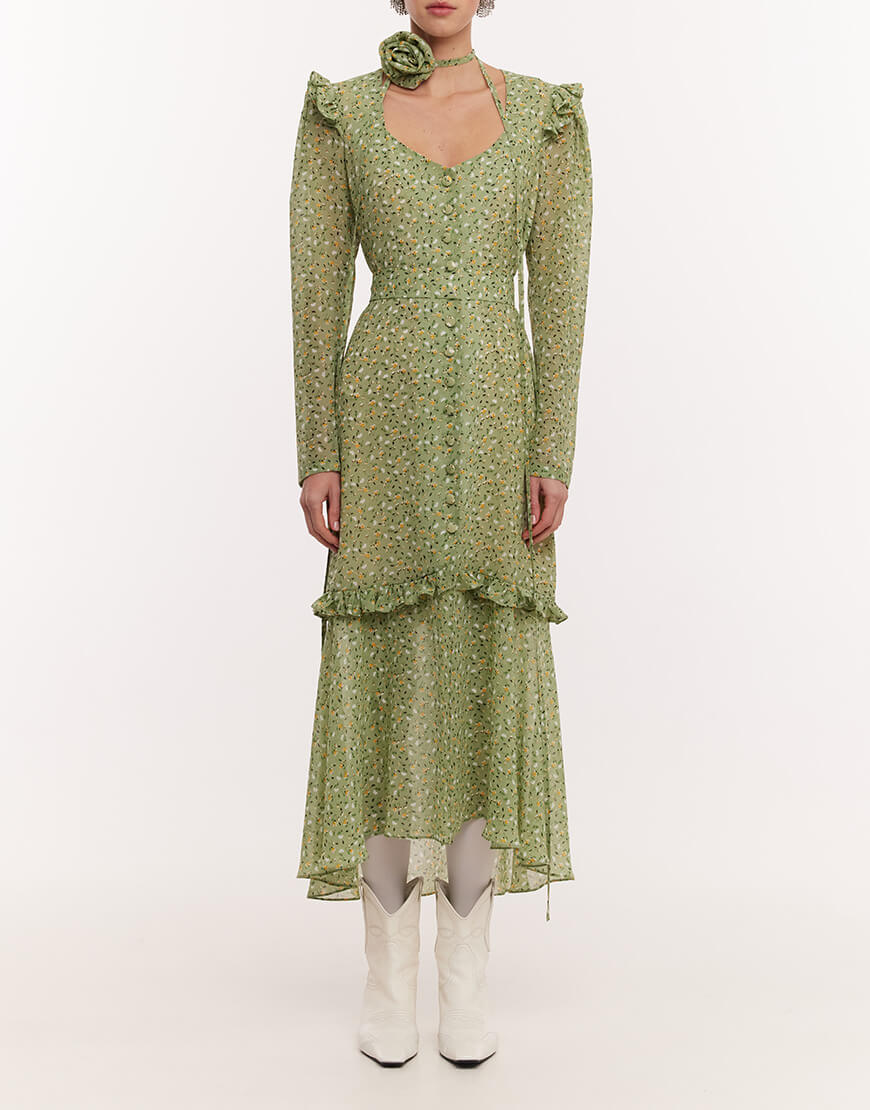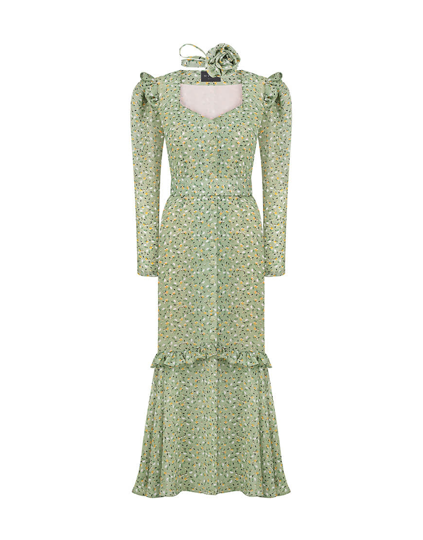 Сукня-міді з розкішного віскозного шифону. Сукня виконана на підкладці. Рукава-ліхтарики та волани створюють додатковий об’єм. Фігурний виріз по ліфу надає сукні особливої витонченості. Пояс та чокер у вигляді троянди в комплекті. Довжина сукні 128 см.