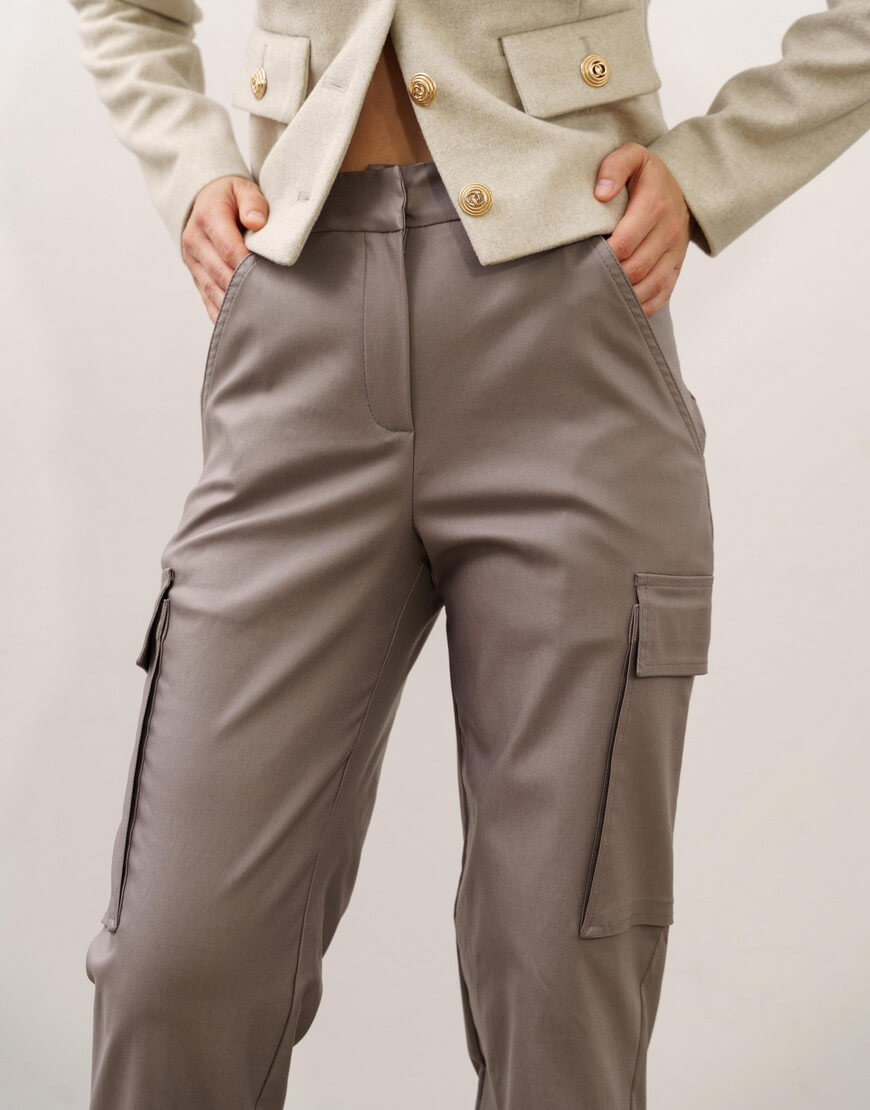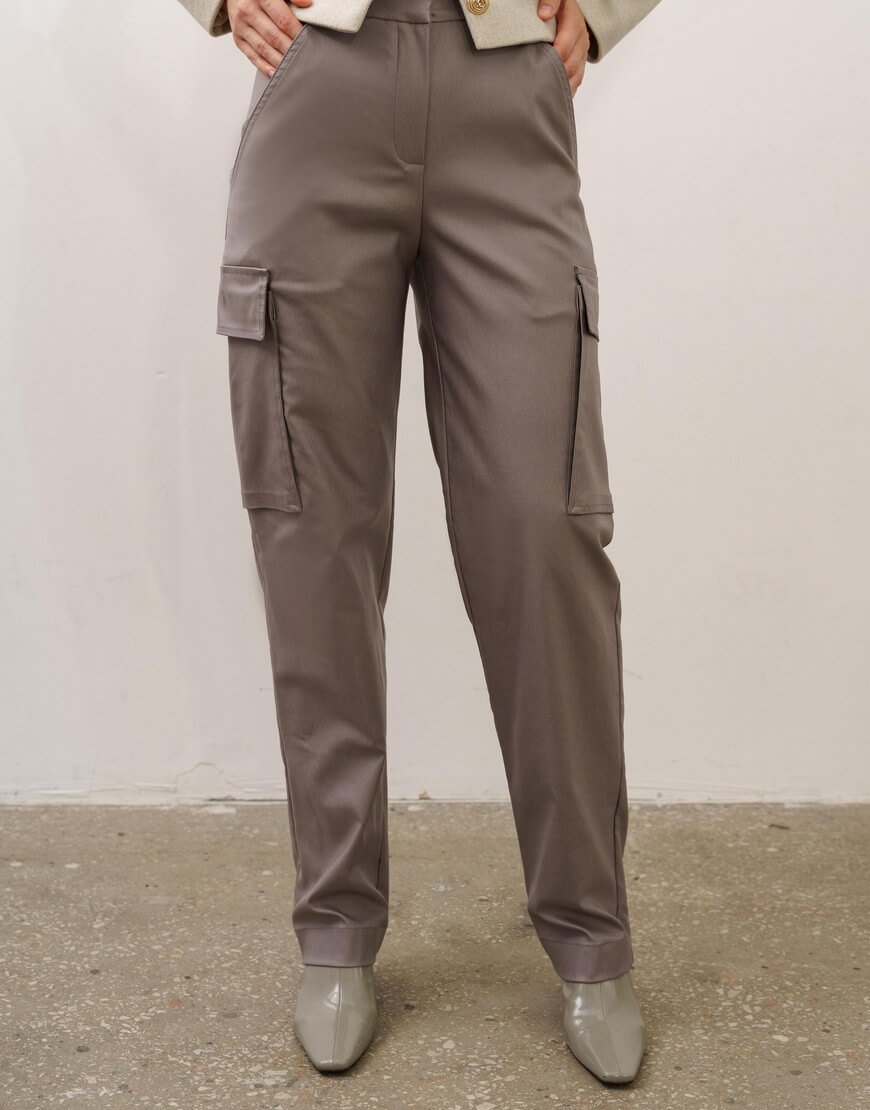 Штани-карго прямого крою з кишенями по боках. Висока лінія талії. Щільна бавовняна тканина з водовідштовхуючою пропиткою.