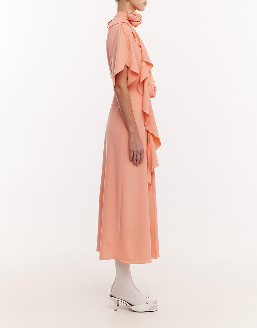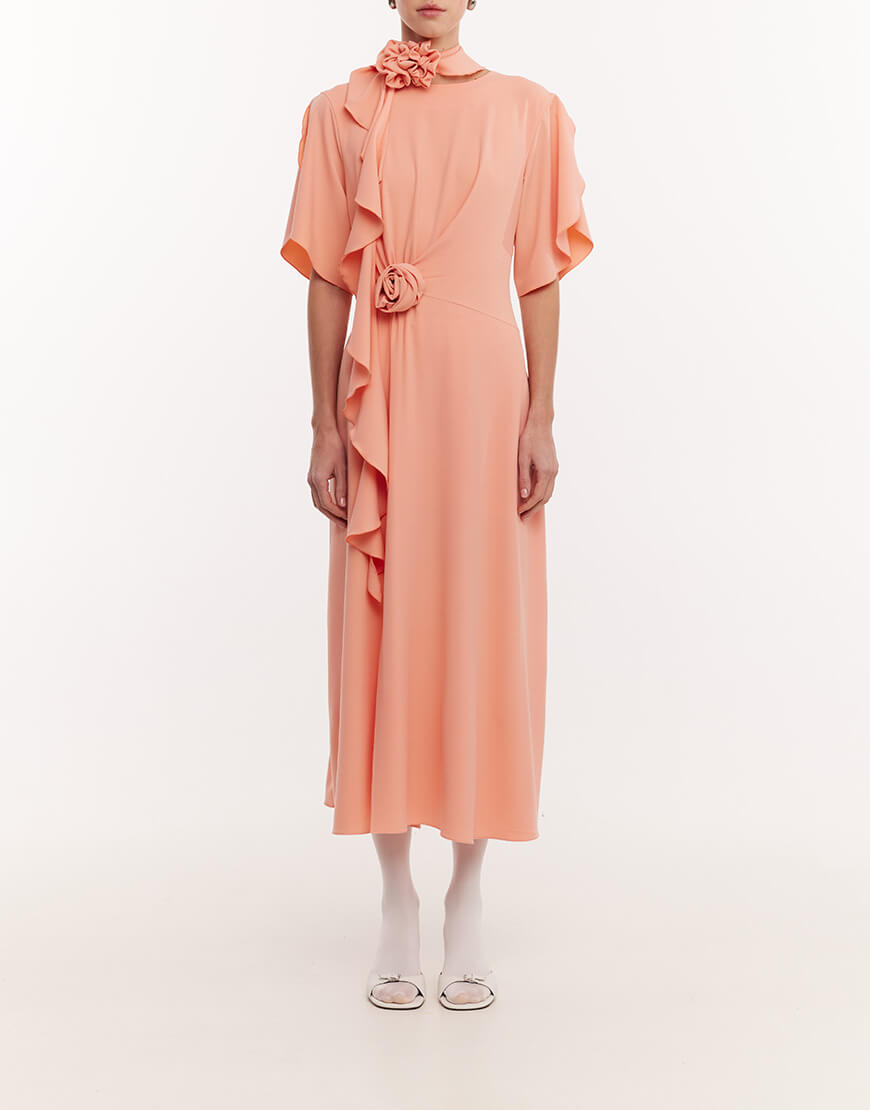 Оригінальна сукня з струмуючої тканини трендового персикового відтінку. Сукня складного асиметричного крою, з драпіюванням по лінії талії, що забезпечує ідеальне, м’яке прилягання по фігурі. Сукня виконана на підкладці. Розріз спереду по спідниці. Сукня декорована квіткою на талії. Застібається ззаду на ґудзик та збоку на потаємну блискавку. У комплекті шарф з квіткою ручної роботи.