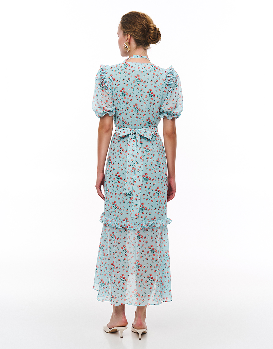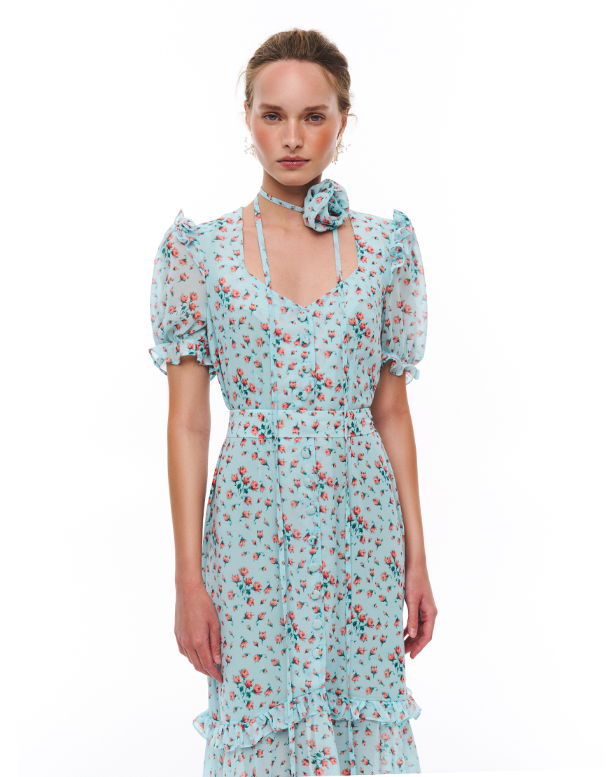 Доставка впродовж 2-10 робочих днівСукня-міді з розкішного віскозного шифону. Сукня виконана на підкладці. Рукава-ліхтарики та волани створюють додатковий об’єм. Фігурний виріз по ліфу надає сукні особивої витонченості. Пояс та чокер у вигляді троянди в комплекті. Преміальна технологія виконання з усіма закритими швами. Довжина сукні 128 см.
