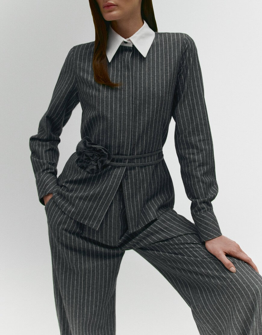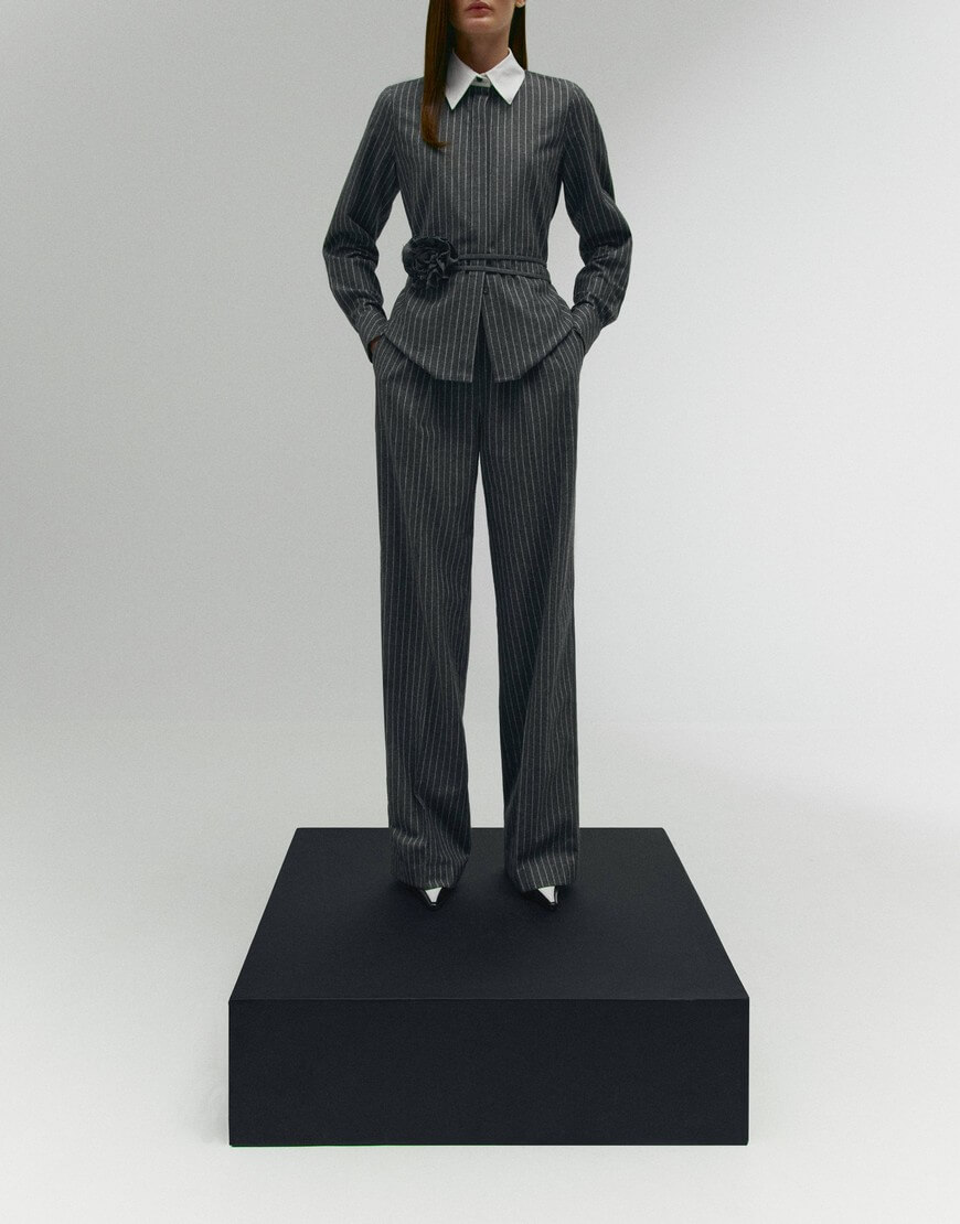 Штани-палаццо з подвійними защипами та кишенями по боках. Висока лінія талії та широкий пояс підкреслюють силует. Широкий манжет по низу штанів.