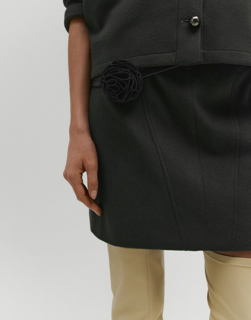 Пряма спідниця міні з щільної вовняної тканини. Висока лінія талії. Застібається ззаду на блискавку. Спідниця декорована фігурними лініями, що візуально подовжують силует. Образ доповнено чокером-поясом, який можна придбати окремо.