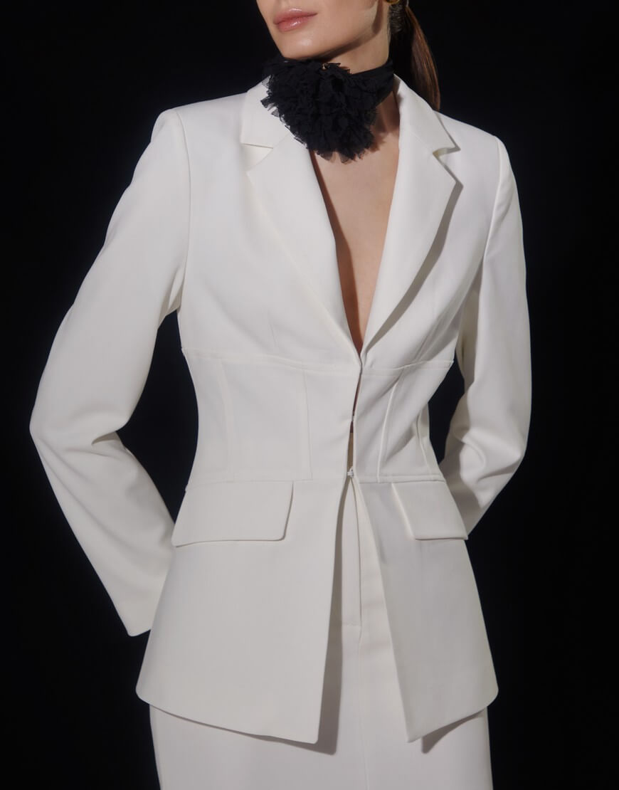 Силуетний піджак однобортного крою на підкладці. Щільна костюмна тканина. Піджак застібається спереду на гачки. Лінія талії підкреслена корсетними лініями.