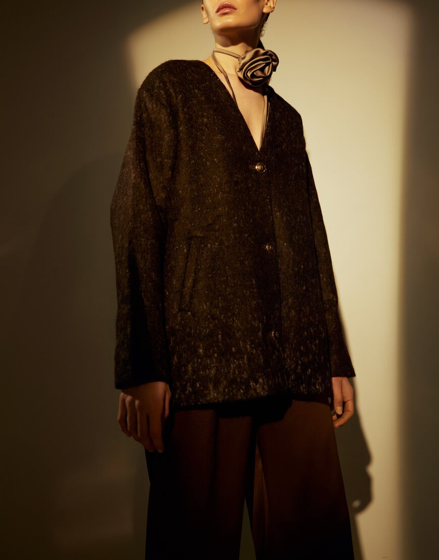 Розкішний кардиган об’ємного крою. Виконаний з теплої, вовняної, м’якої тканини. Кардиган виконано з цільнокроєних деталей, що надає виробу струмуючого силуету. Виріб виконано на підкладці.