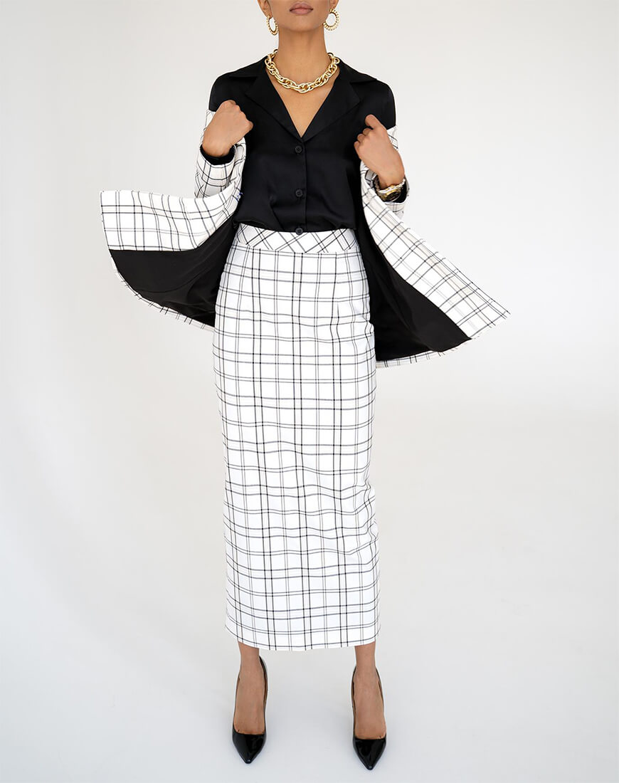 Класична спідниця-олівець приталеного крою з високою лінією талії та шліцею. Застібається ззаду на потаємну блискавку. Виконана з м’якої вовняної тканини та віскозної підкладки.