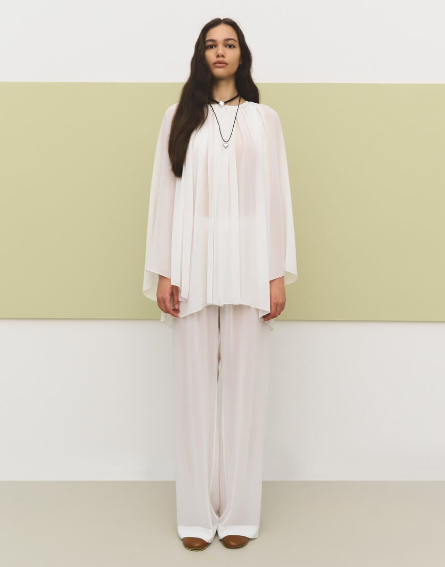 Костюм з м’якої, шифонової тканини, який складається з подовженої блузи вільного крою та широких штанів на резинці. Невагома, струмуюча тканина у поєднані з надзвичайно об’ємним кроєм надають силуету особливої витонченості. На один такий костюм ми використовуємо понад 5 метрів тканини, аби надати рясно всіяного, об’ємного драпіювання, як блузі, так і штанам.