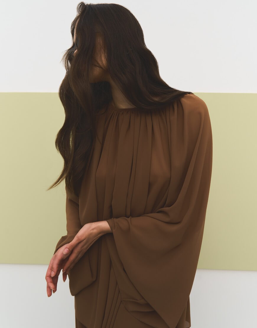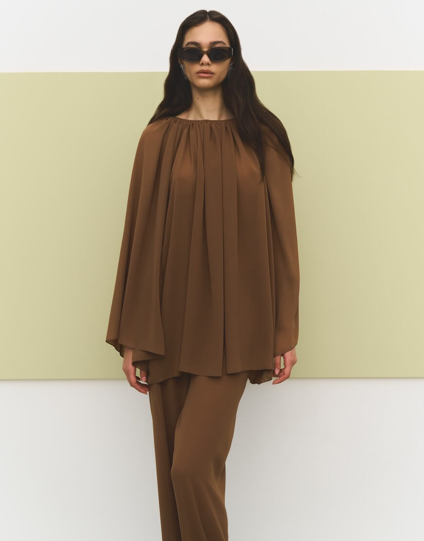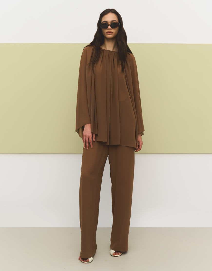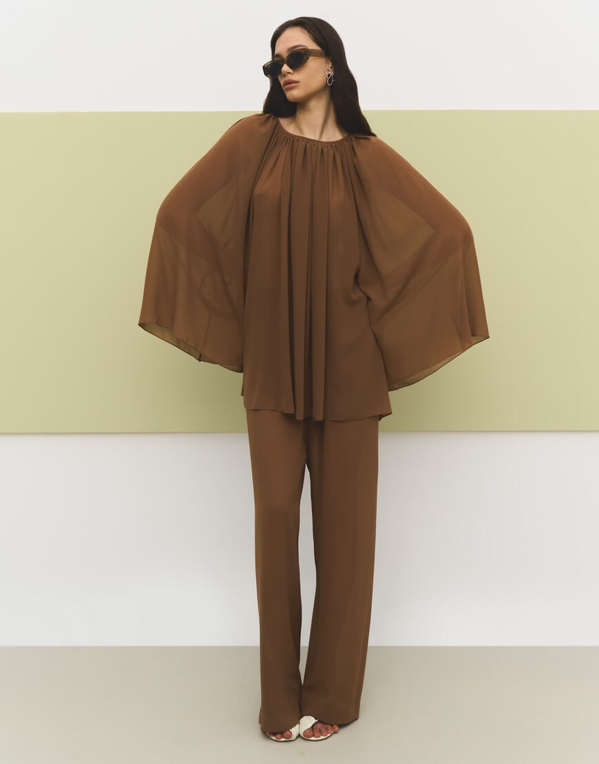 Костюм з м’якої, шифонової тканини, який складається з подовженої блузи вільного крою та широких штанів на резинці. Невагома, струмуюча тканина у поєднані з надзвичайно об’ємним кроєм надають силуету особливої витонченості. На один такий костюм ми використовуємо понад 5 метрів тканини, аби надати рясно всіяного, об’ємного драпіювання, як блузі, так і штанам.