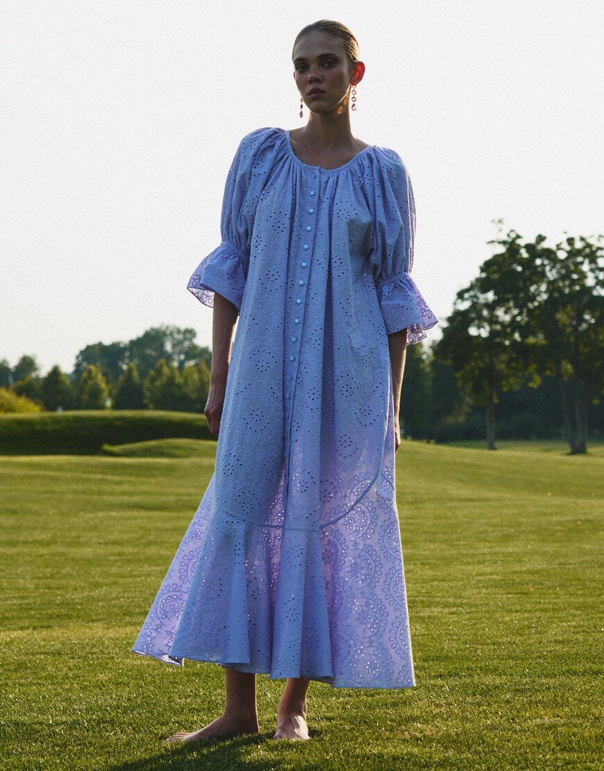 Сукня-максі з вишитого бавовняного батисту об’ємного, вільного крою. Рукава-ліхтарики створюють додатковий об’єм. Сукня застібається спереду на гудзики. Пояс в комплекті.