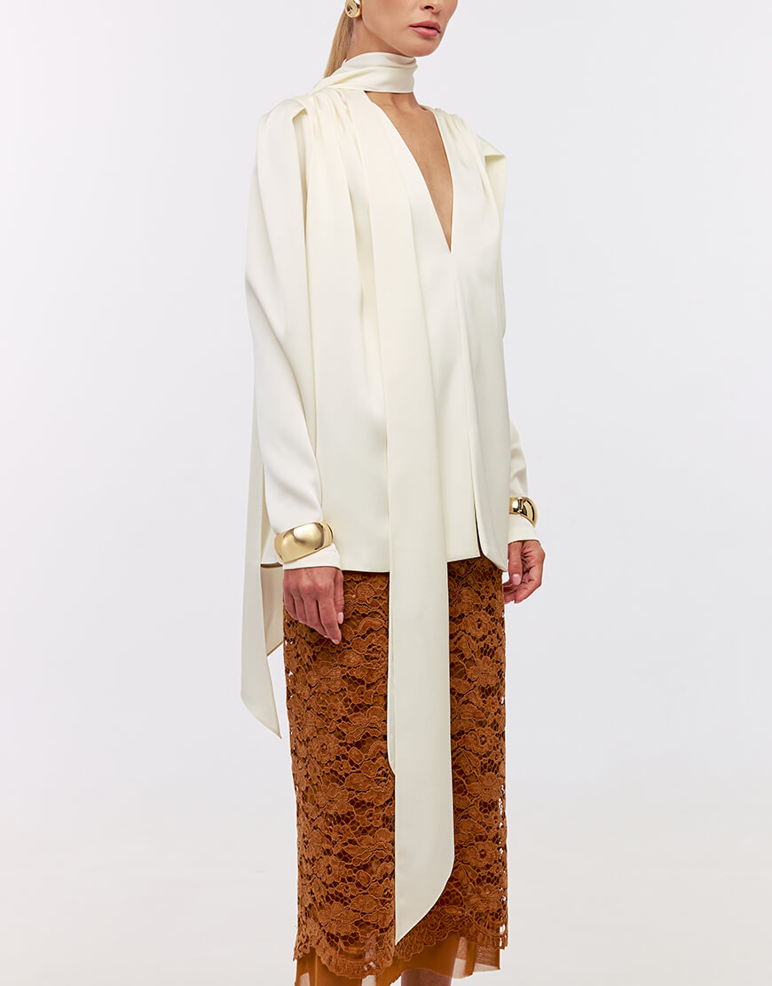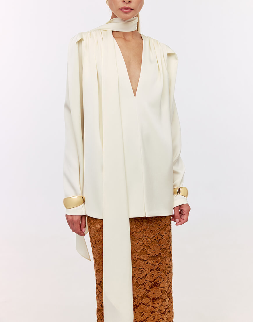 Доставка впродовж 2-10 робочих днівСатинова блуза об’ємного крою. Рукава-ліхтарики та глибокий виріз надають витонченості силуету. Блуза виконана з усіма закритими швами та подвійними передніми полочками. В комплекті чокер-шалик.