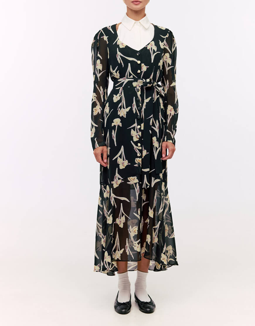 Сукня-міді з розкішного віскозного шифону. Сукня виконана на підкладці. Рукава-ліхтарики створюють додатковий об’єм. Фігурний виріз по ліфу надає сукні особивої витонченості. Пояс та чокер у вигляді троянди в комплекті. Преміальна технологія виконання з усіма закритими швами. Довжина сукні 130 см.