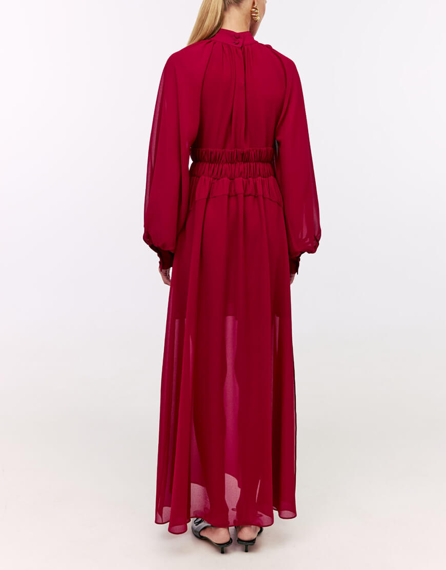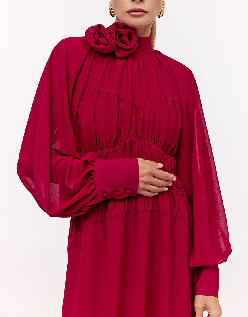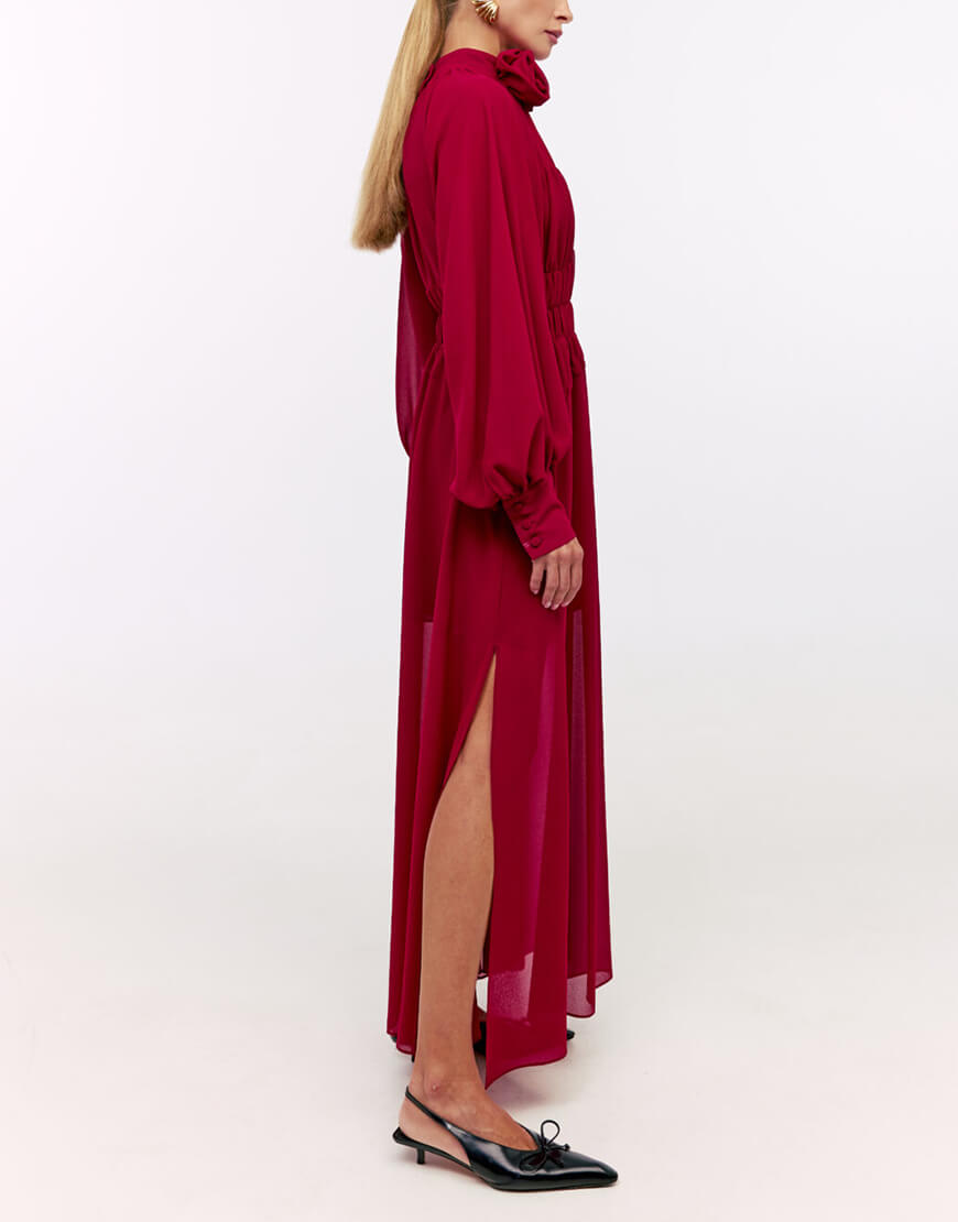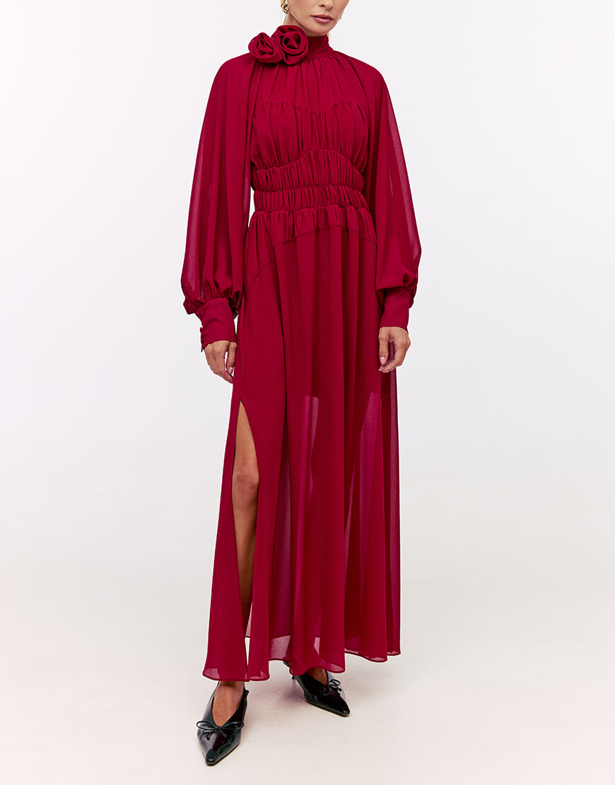 Сукня-максі з розкішного віскозного шифону. Сукня виконана на підкладці. Об’ємні рукава з широкими манжетами. Фігурні вирізи з драпіруваннями по ліфу та талії надають сукні особивої витонченості. Лінія талії виконана на резинці. Горловина сукні декорована квітами ручної роботи. Преміальна технологія виконання з усіма закритими швами. Довжина сукні 140 см. Сукня має два бокові розрізи по спілниці.