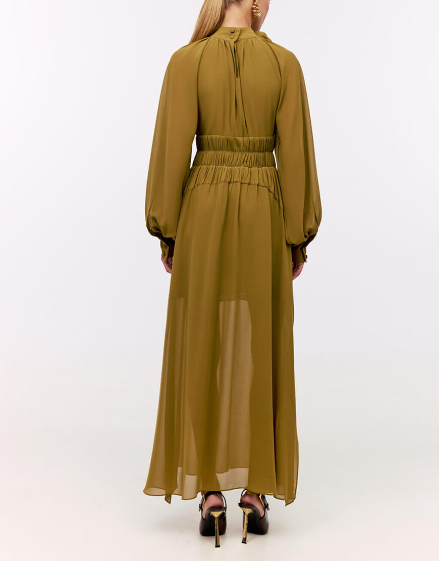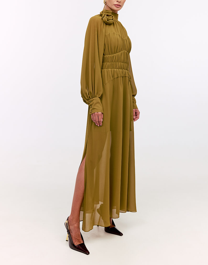 Доставка впродовж 2-10 робочих днівСукня-максі з розкішного віскозного шифону. Сукня виконана на підкладці. Об’ємні рукава з широкими манжетами. Фігурні вирізи з драпіруваннями по ліфу та талії надають сукні особивої витонченості. Лінія талії виконана на резинці. Горловина сукні декорована квітами ручної роботи. Преміальна технологія виконання з усіма закритими швами. Довжина сукні 140 см. Сукня має два бокові розрізи по спілниці.