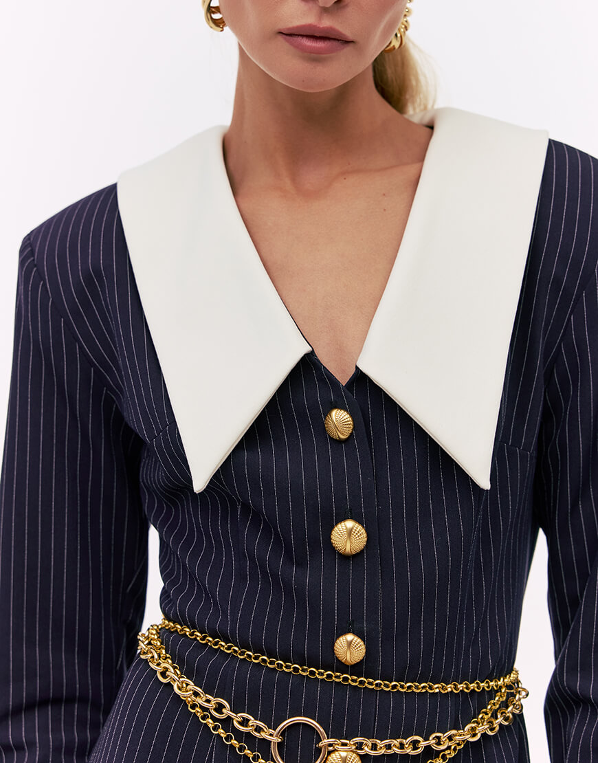 Сукня прямого крою з білим комірцем з акцентними плечима. Виконана на підкладці з м’якої костюмної тканини в тонку смужку. Сукня застібається спереду на металеві гудзики. Довжина сукні 130 см.