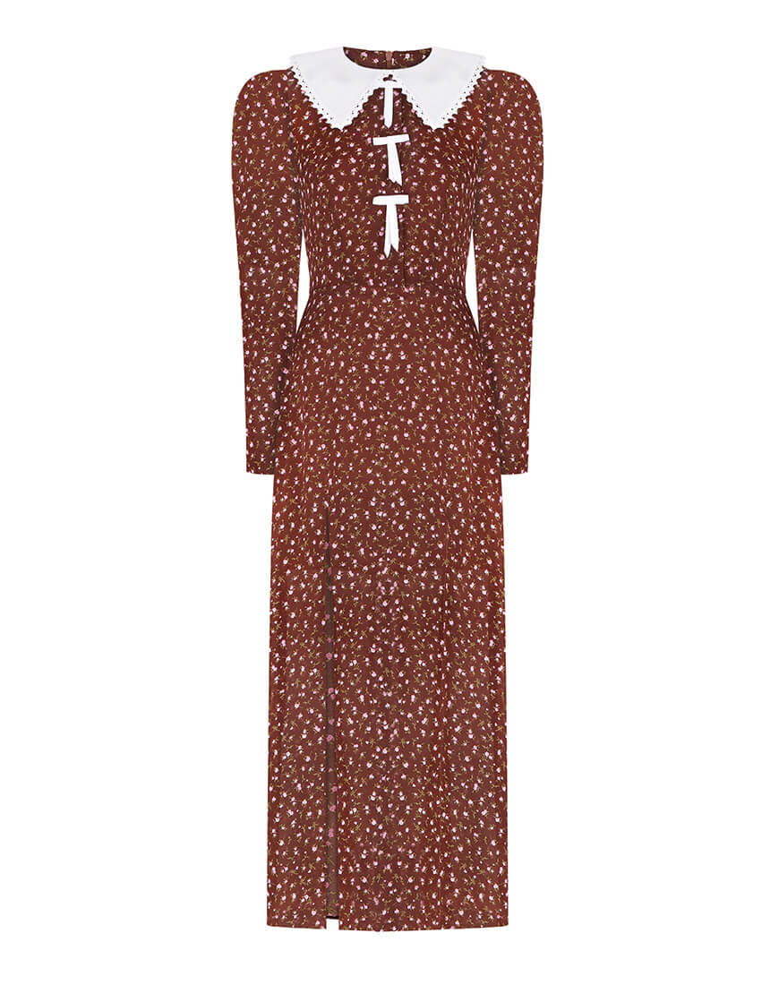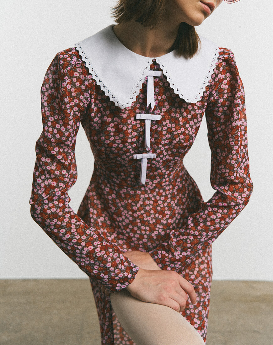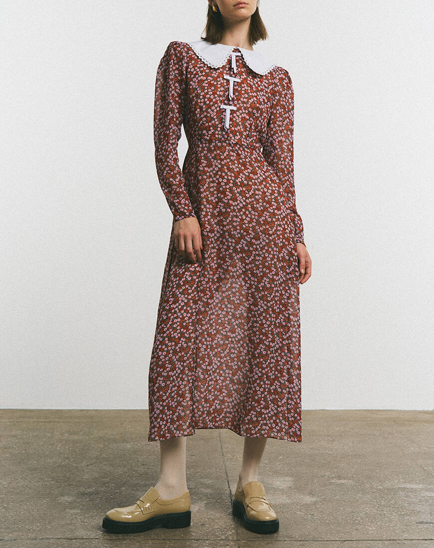 Сукня-міді з розкішного віскозного шифону. Сукня виконана на підкладці. Рукава-ліхтарики створюють додатковий об’єм. Білий комірець, що оздоблений мереживом по периметру, надає сукні особливої витонченості. Спереду, сукня декорована маленькими білими бантиками. Сукня застібається ззаду на потаємну блискавку. Довжина сукні 128 см.