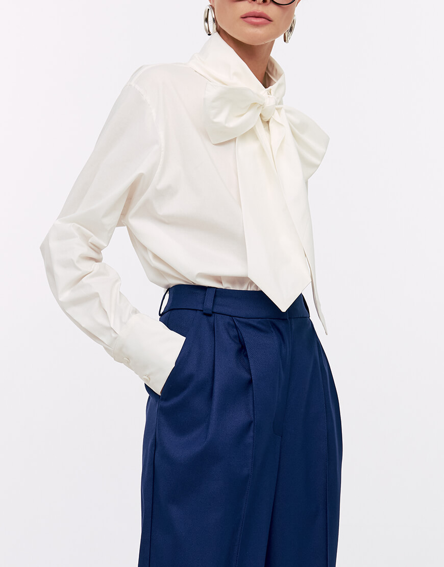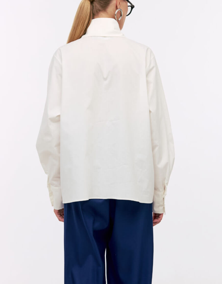 Сорочка з м’якої бавовняної тканини об’ємного крою. Застібається на гудзики. Преміальна технологія виконання з усіма закритими швами. Гіперболізований комір, який дозволяє завʼязати його у красивий, обʼємний бант.
