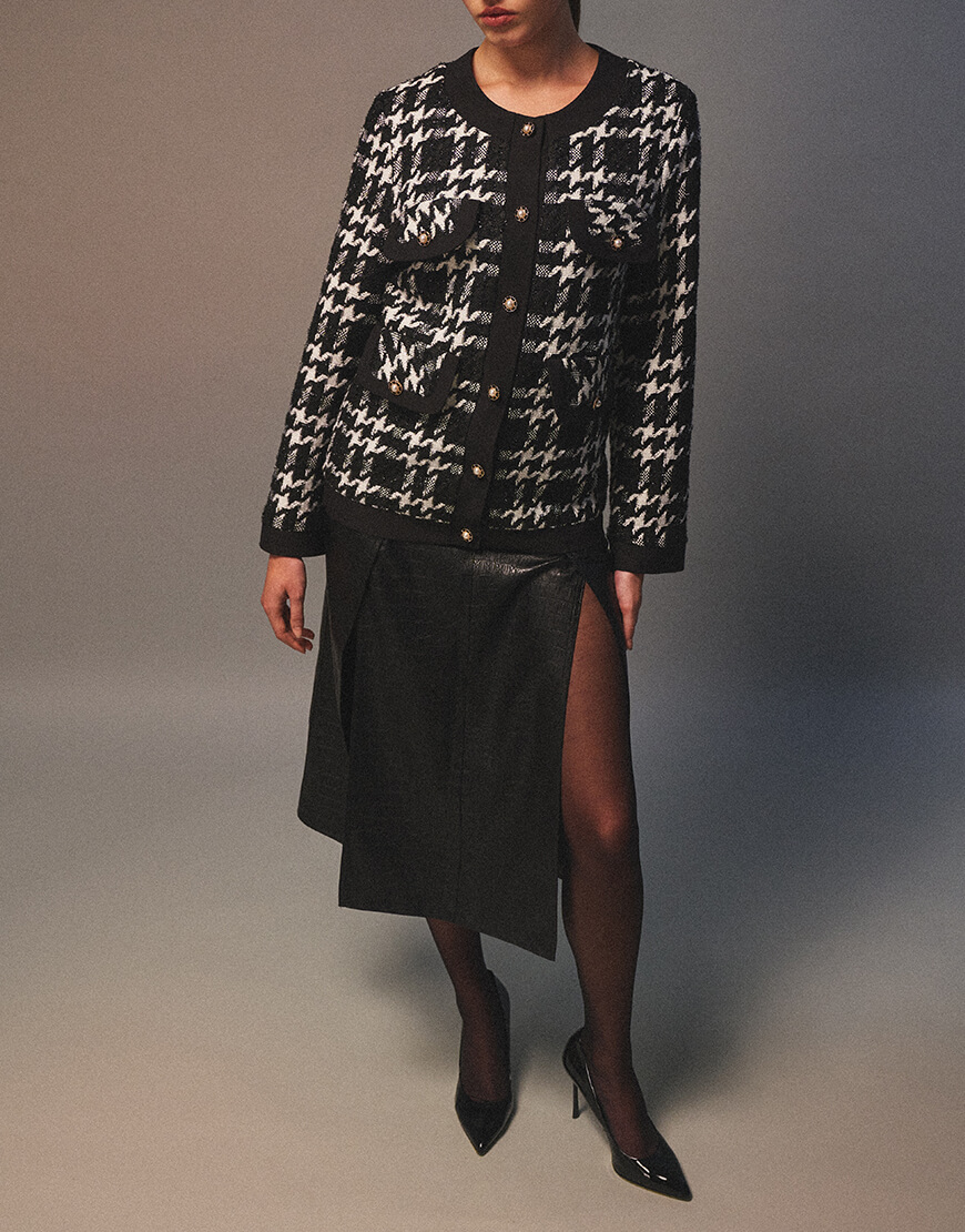 Міді спідниця з двома симетричними розрізами по ніжках. Висока лінія талії. Застібається спереду на блискавку. Спідниця виконана зі щільної екошкіри на замшевій основі.