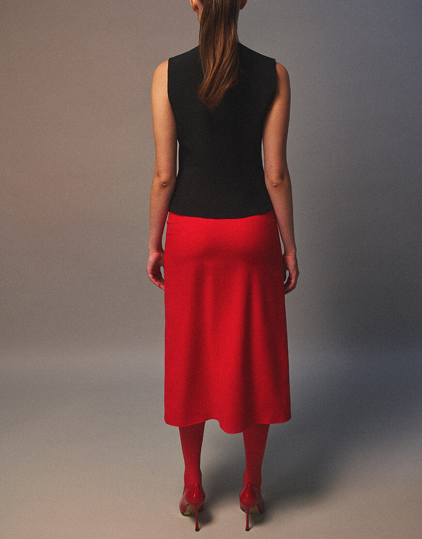 Міді спідниця з двома симетричними розрізами по ніжках. Висока лінія талії. Застібається спереду на блискавку. Спідниця виконана на підкладці.