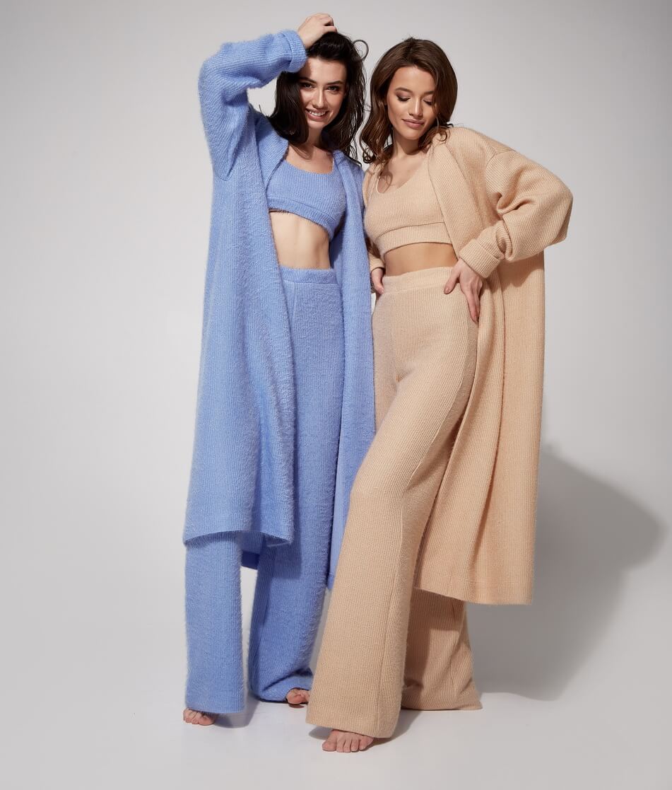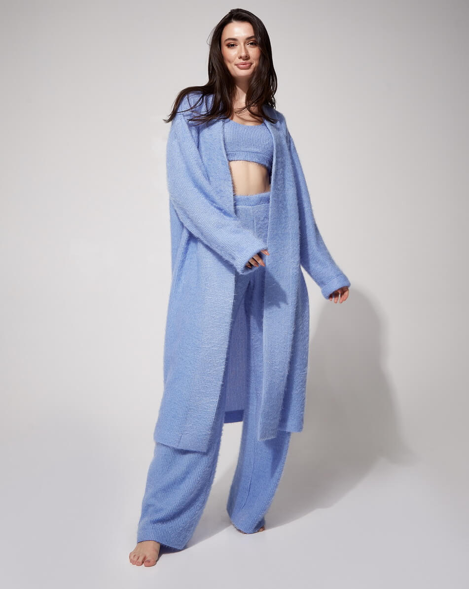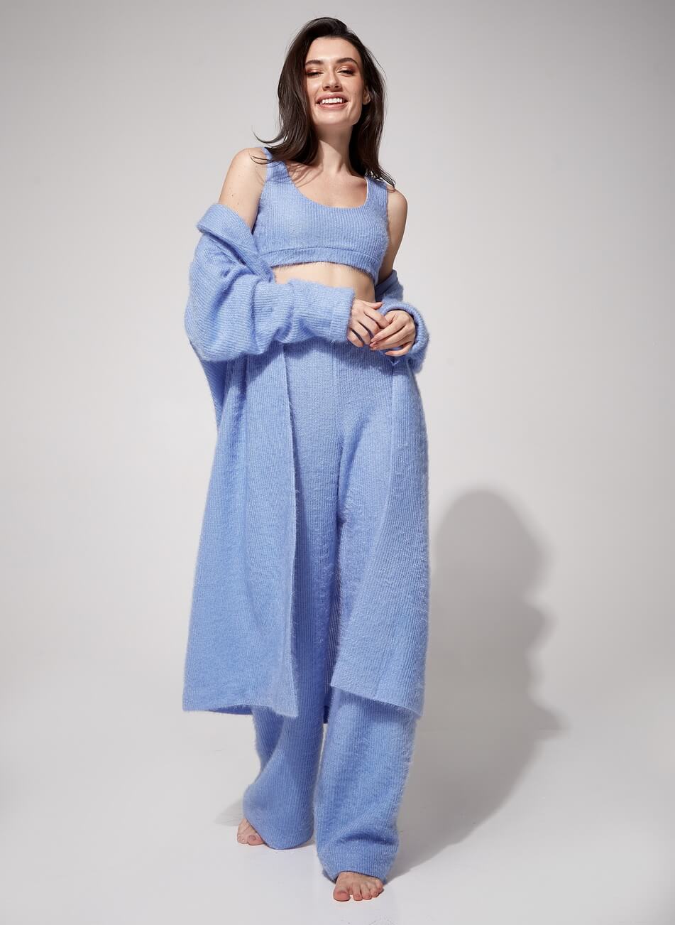М’який трикотажний костюм, який складається з 3 одиниць: штани, топ і кардиган. Штани прямого крою з високою лінією талії на гумці. Топ укорочений на підкладці. Кардиган вільного крою, рукав-реглан, пояс у комплекті.