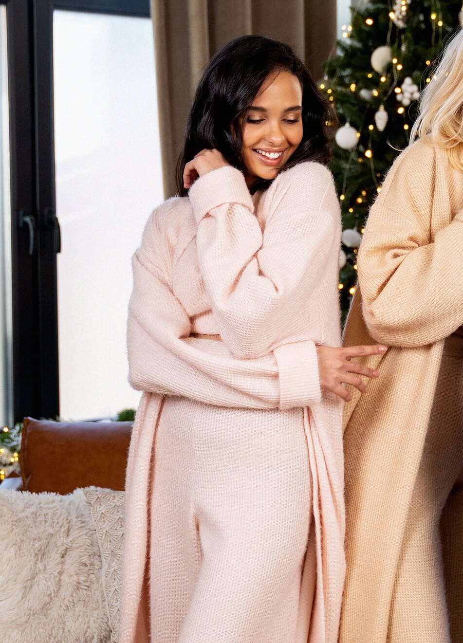 М’який трикотажний костюм, який складається з 3 одиниць: штани, топ і кардиган. Штани прямого крою з високою лінією талії на гумці. Топ укорочений на підкладці. Кардиган вільного крою, рукав-реглан, пояс у комплекті.