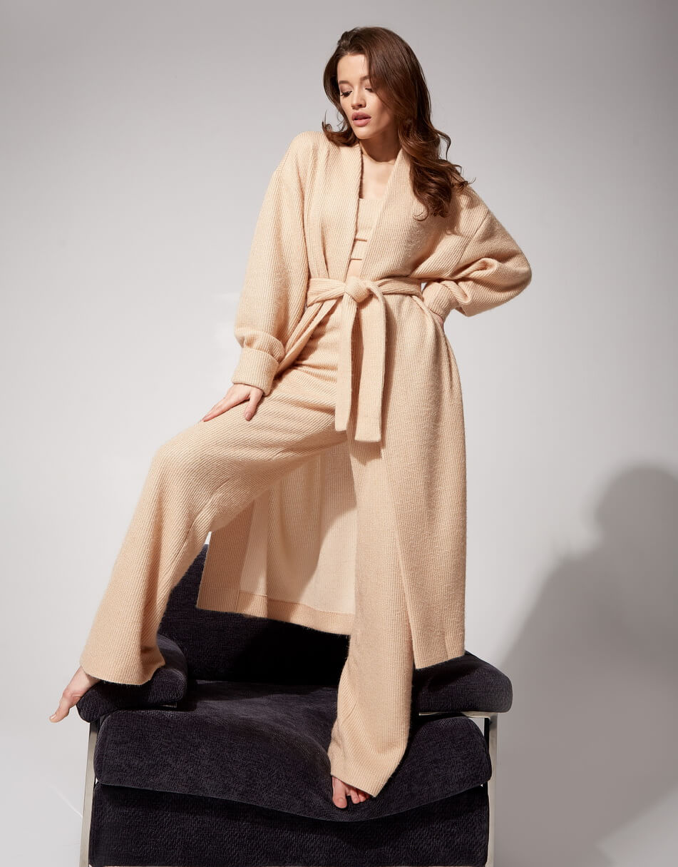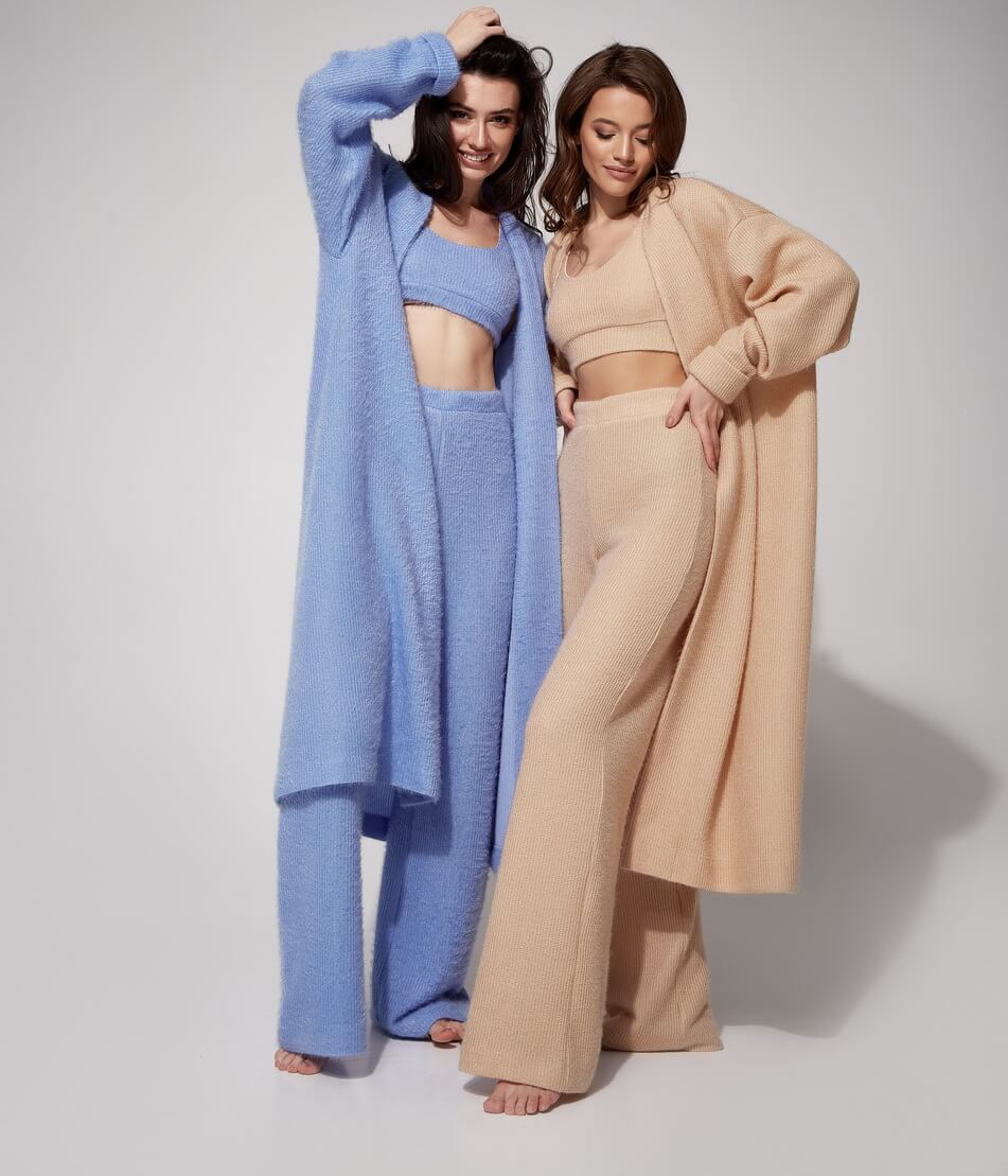 М’який трикотажний костюм, який складається з 3 одиниць: штани, топ і кардиган. Штани прямого крою з високою лінією талії на гумці. Топ укорочений на підкладці. Кардиган вільного крою, рукав-реглан, пояс у комплекті.