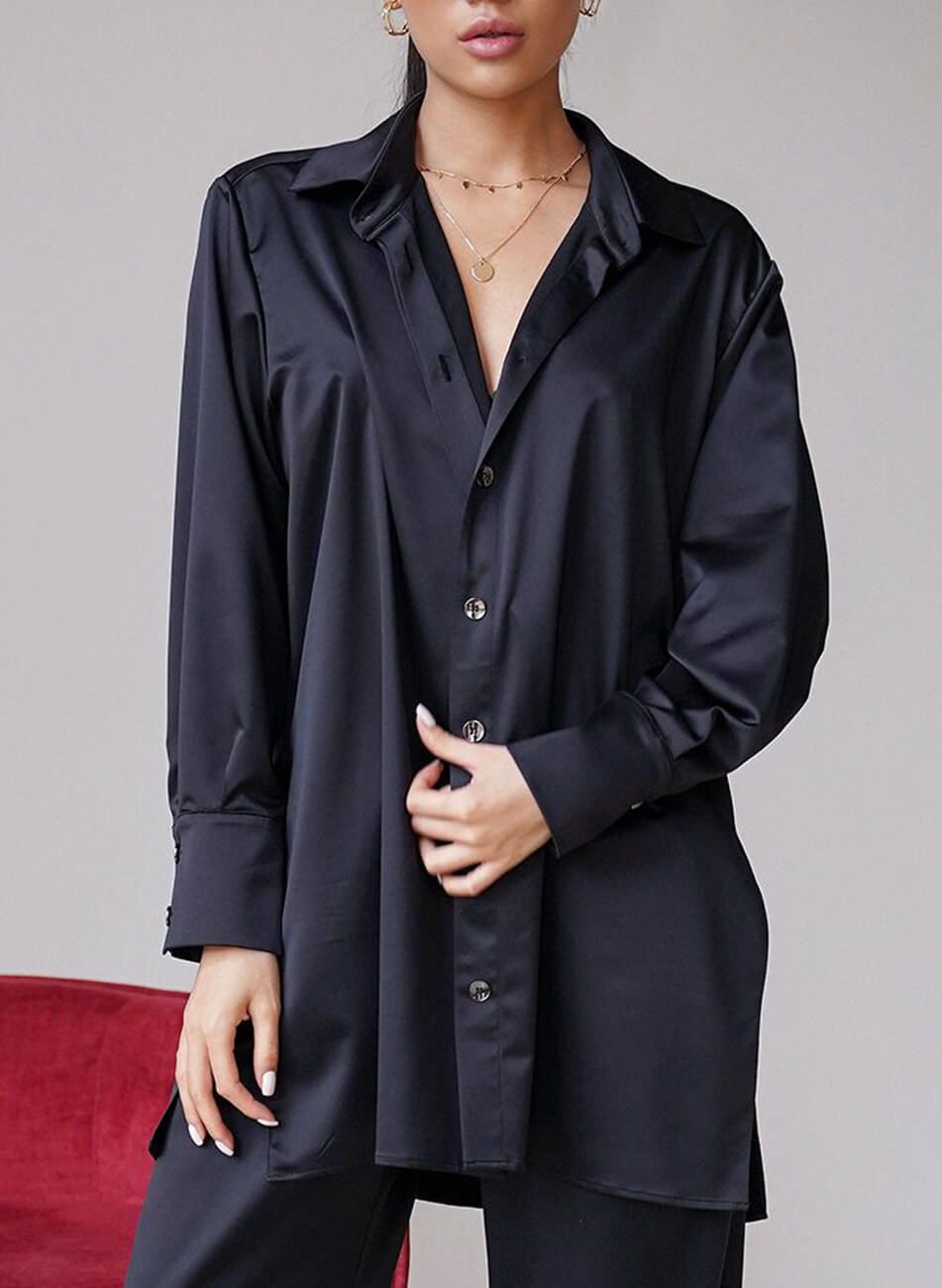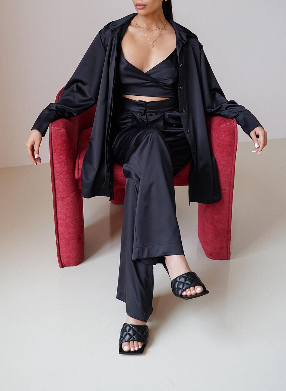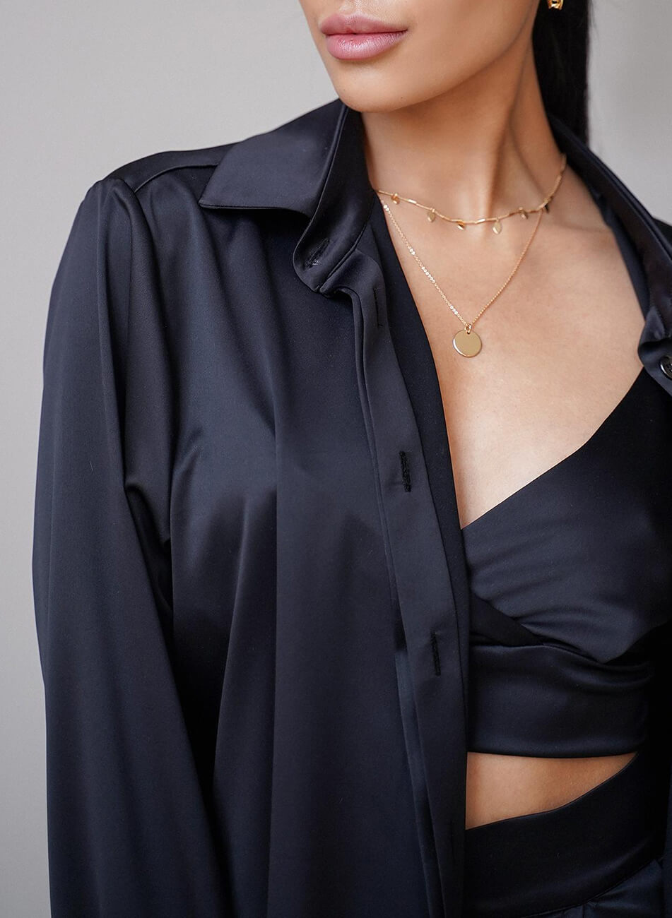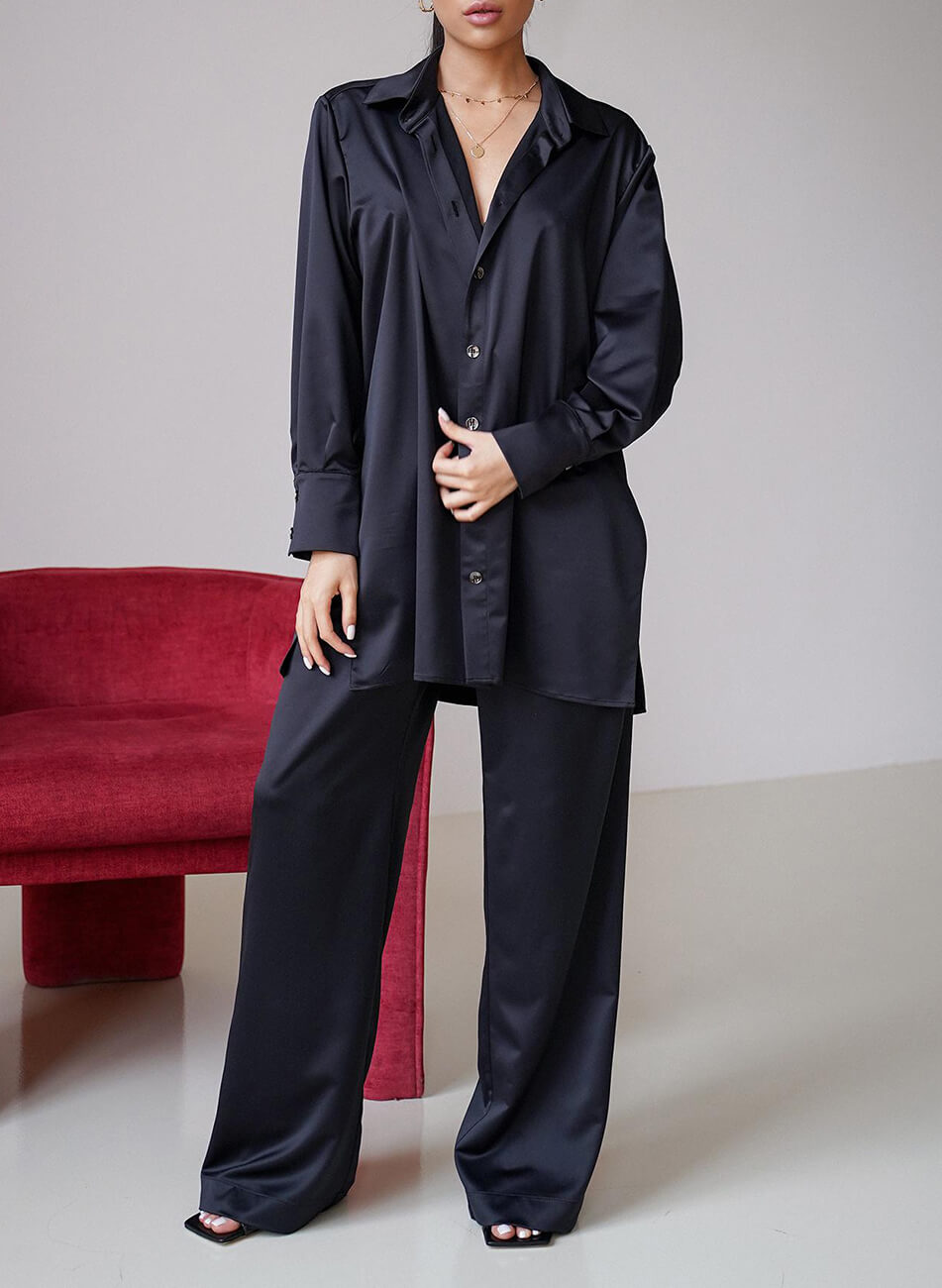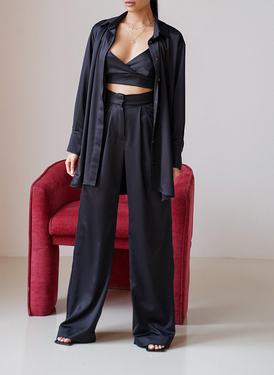 Костюм з ацетатного шовку, який складається з подовженої блузи вільного крою, штанів-палаццо і топа.