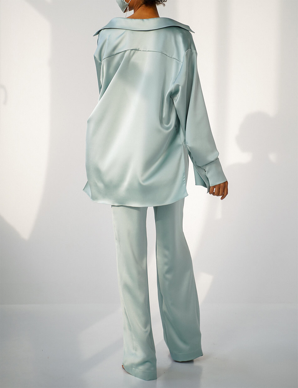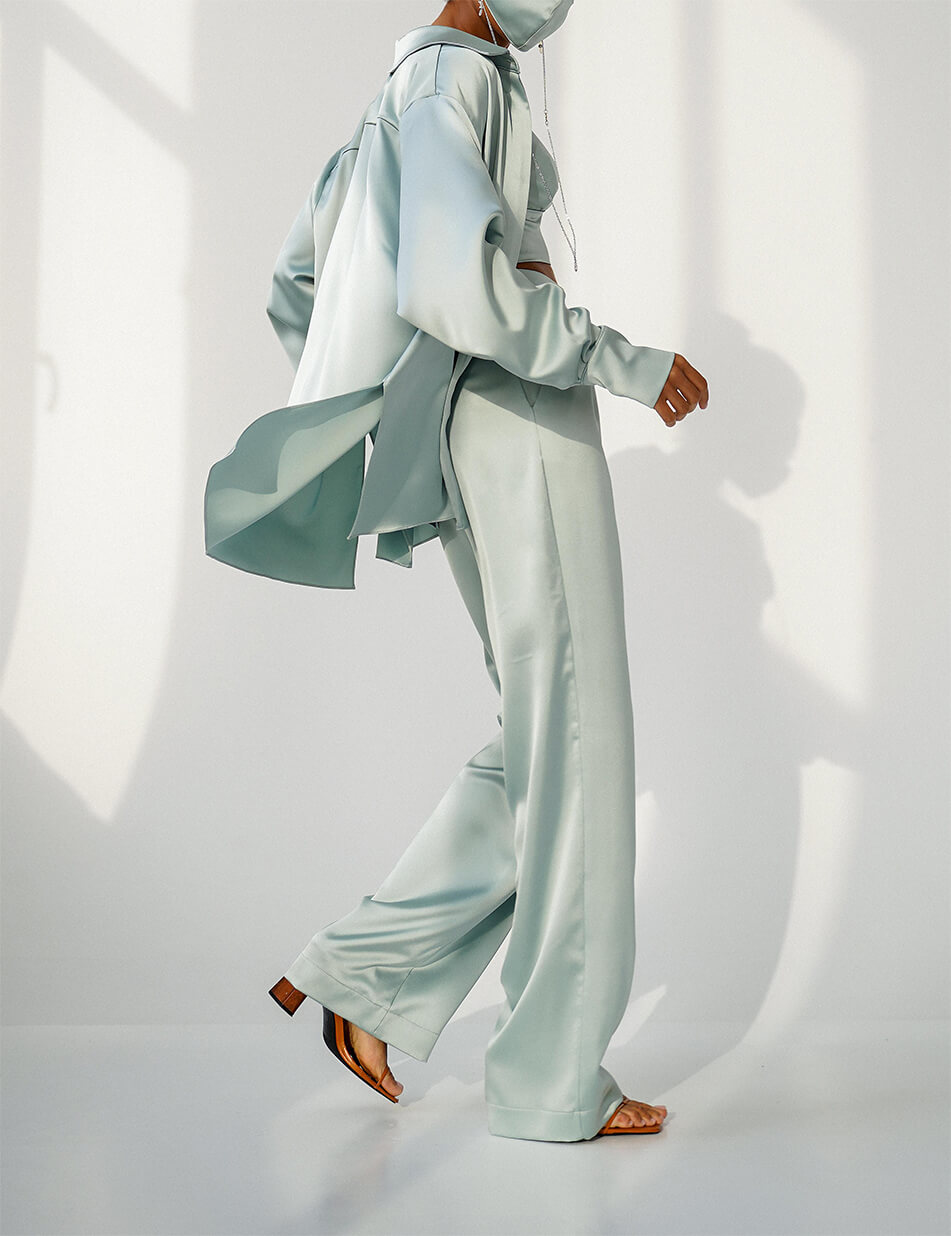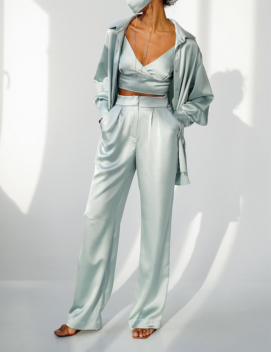 Костюм з ацетатного шовку, який складається з подовженої блузи вільного крою, штанів-палаццо і топа.