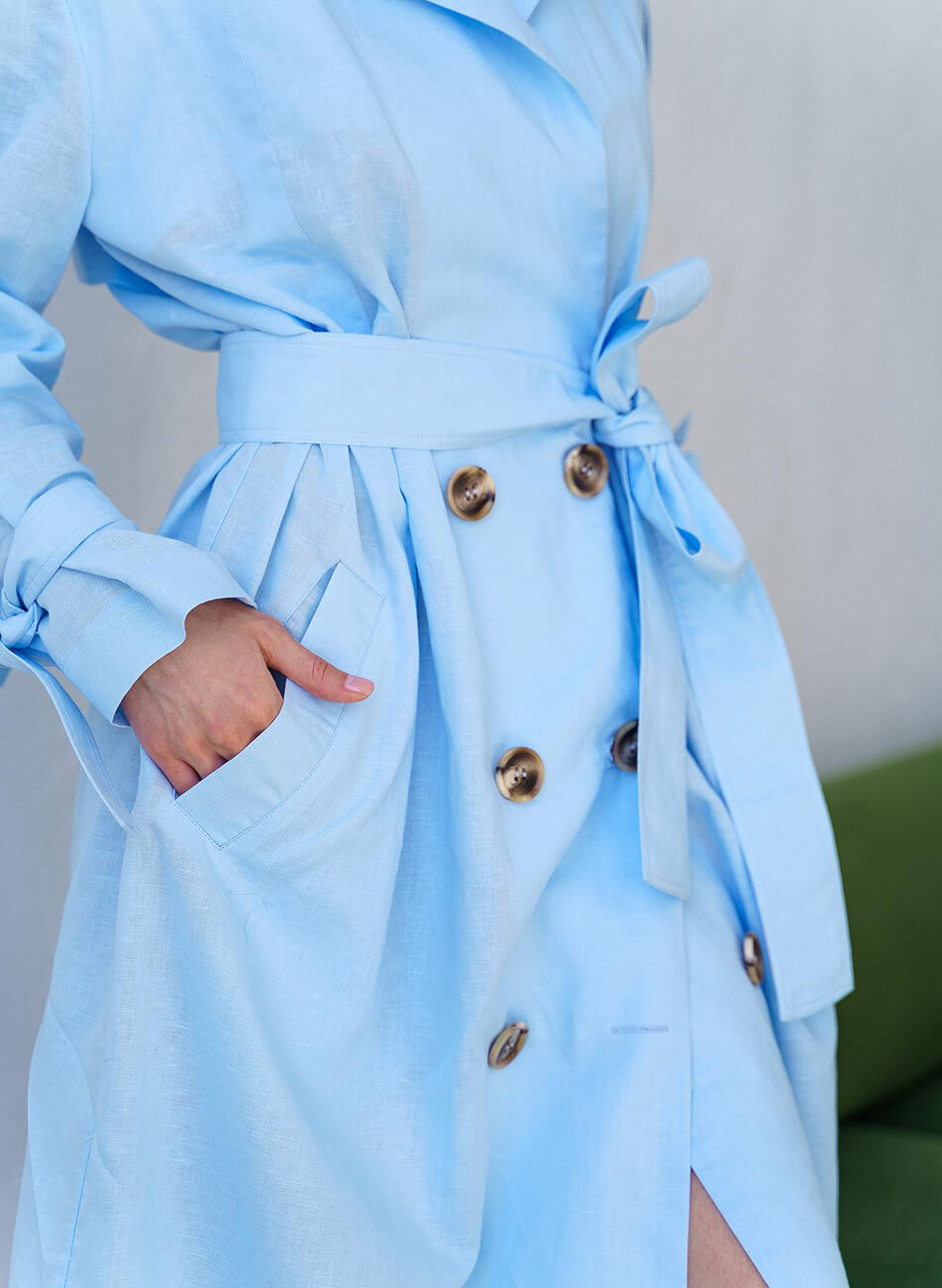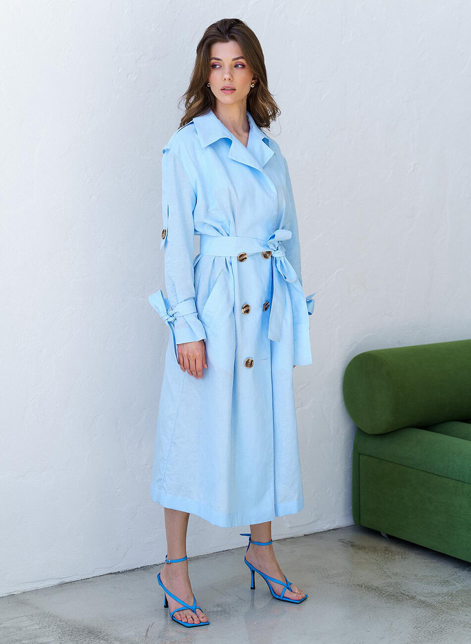 Тренч об’ємного, двобортного крою та подовженої міді довжини з 100% льону. Тренч виконано без підкладки з усіма окантованими швами та об’ємними карманами по бокам. Рукава внузу фіксуються широкими ременями, які завязуються у бант. Тренч застібається на гудзики. Довжина виробу 125 см. Тренч виконано у 2 суміжних розмірах: XS/S, M/L.