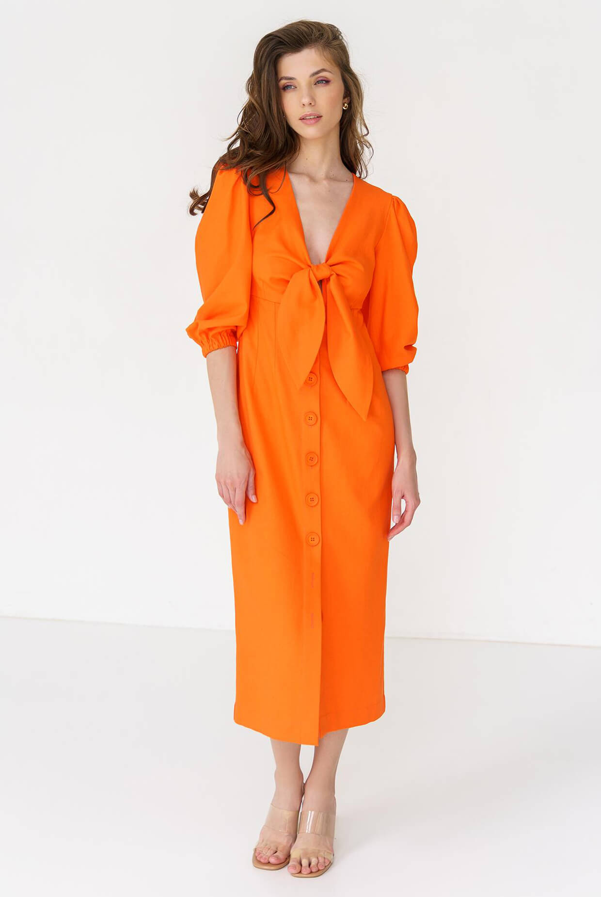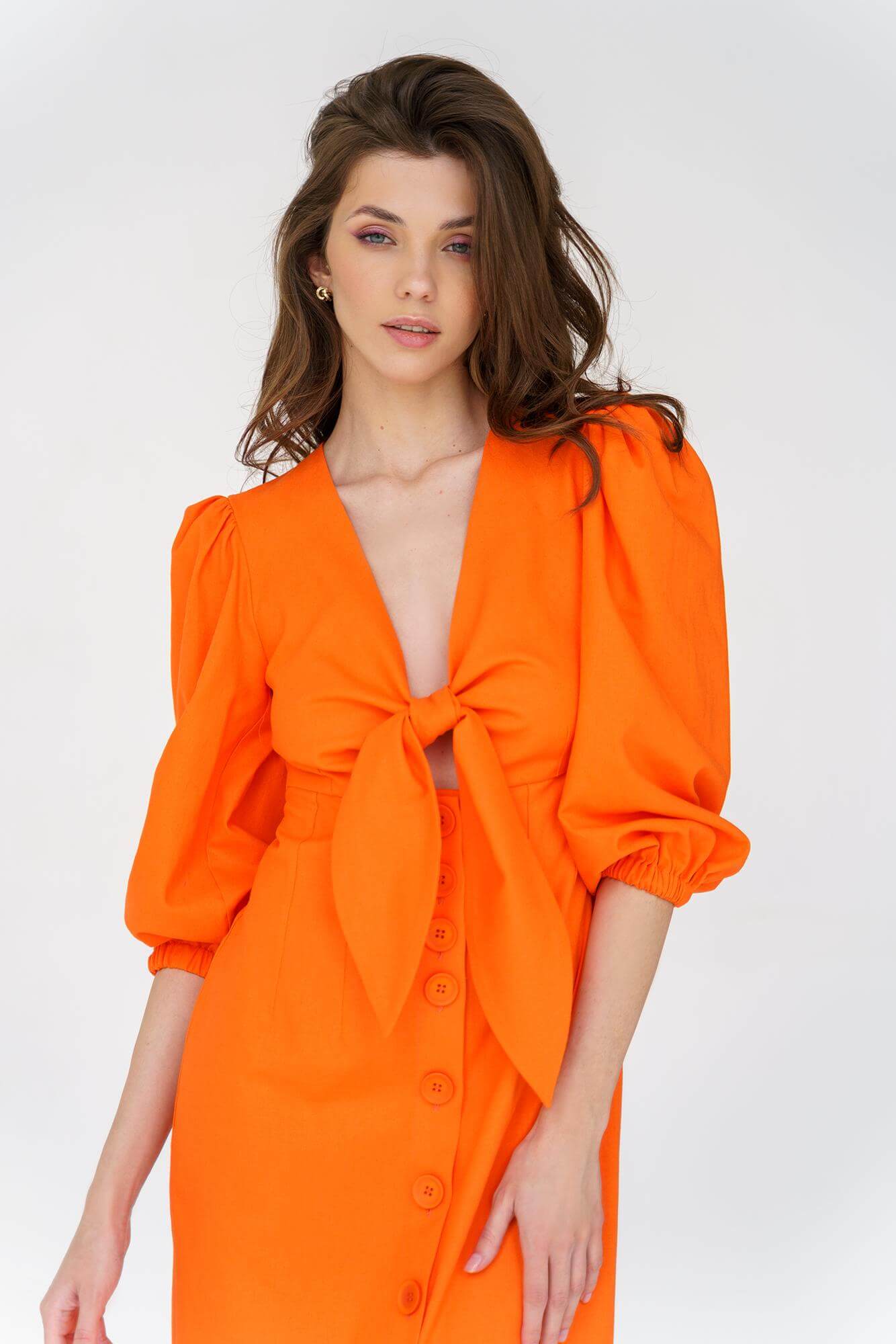 Легка, романтична сукня оригінального крою з об’ємними рукавами. Лляна тканина ідеально підходить для літньої спеки. Сукня застібається на ґудзики, а також зав’язується на бант.
