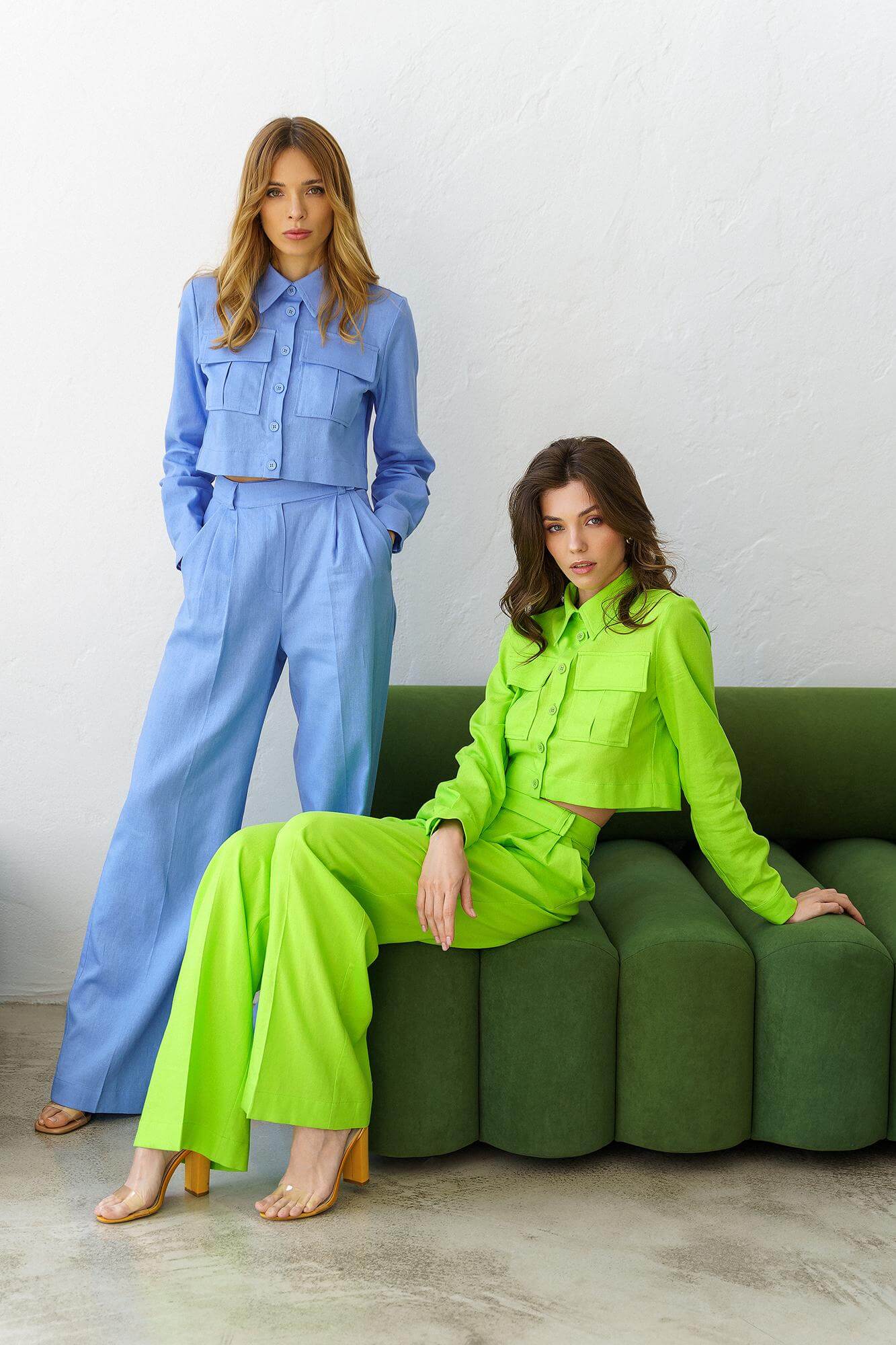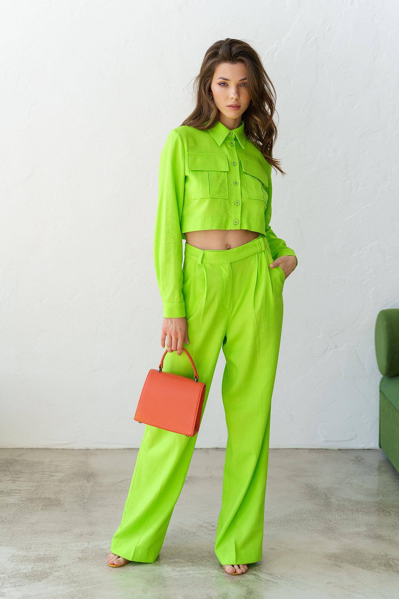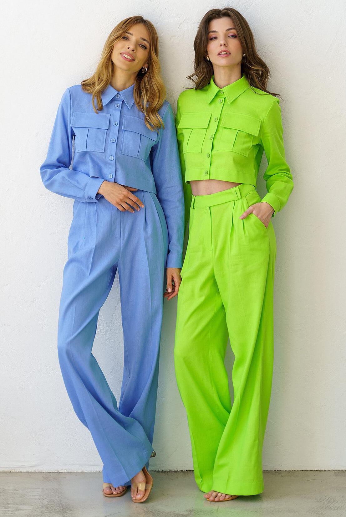 Лляний, яскравий костюм. Об’ємна укорочена сорочка з накладними кишенями. Штани-палаццо з високою лінією талії, вільного крою. Застібаються на потаємну блискавку та гачок. Костюм бездоганно поєднується як із взуттям на підборах, так і з плоскою підошвою.
