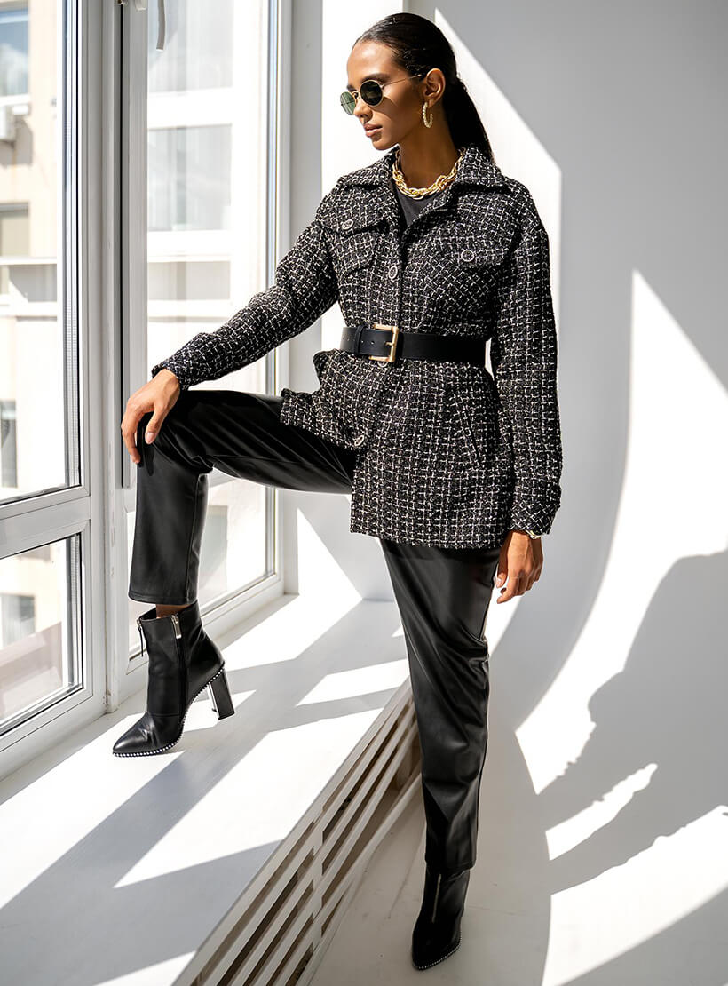 Тепла подовжена сорочка-курточка. Виконана з м’якої тканини. Кишені з боків і накладні на грудях. Пояс не входить до комплекту.