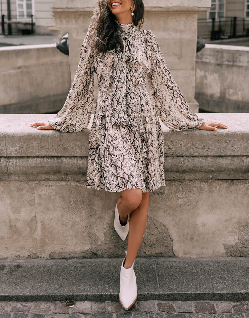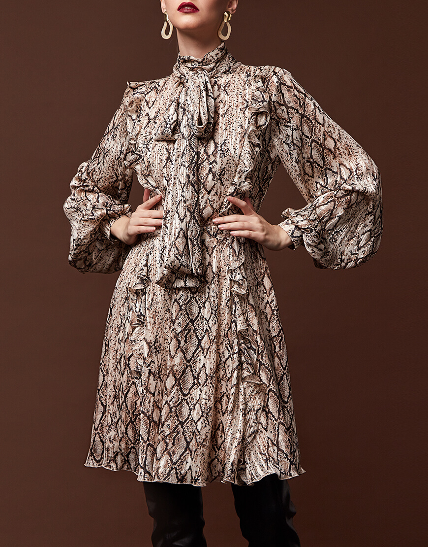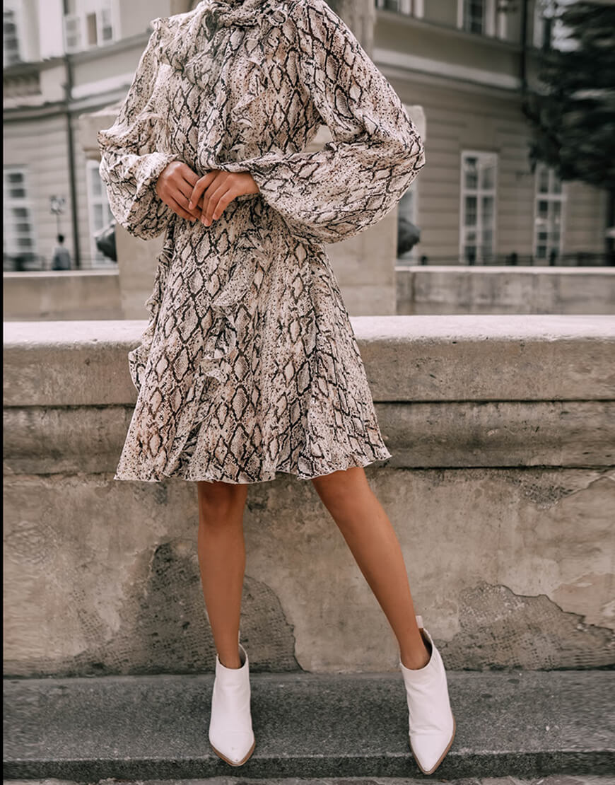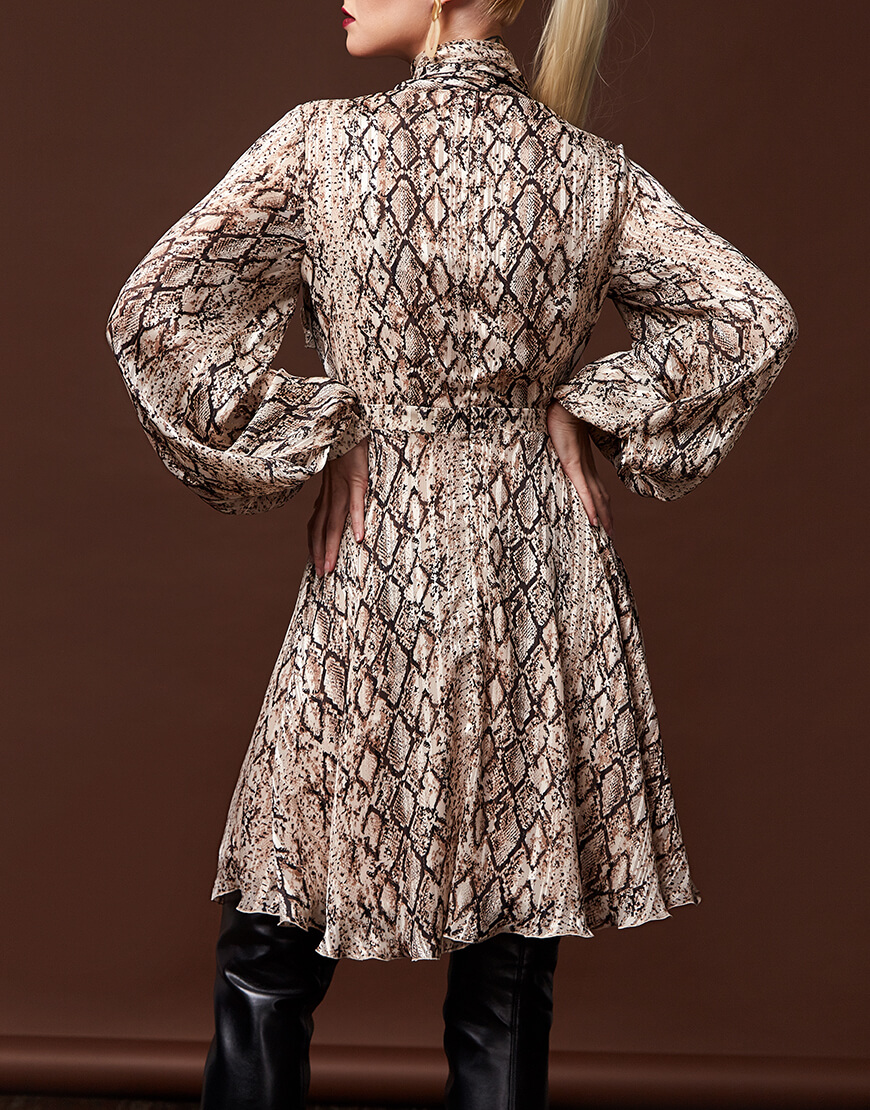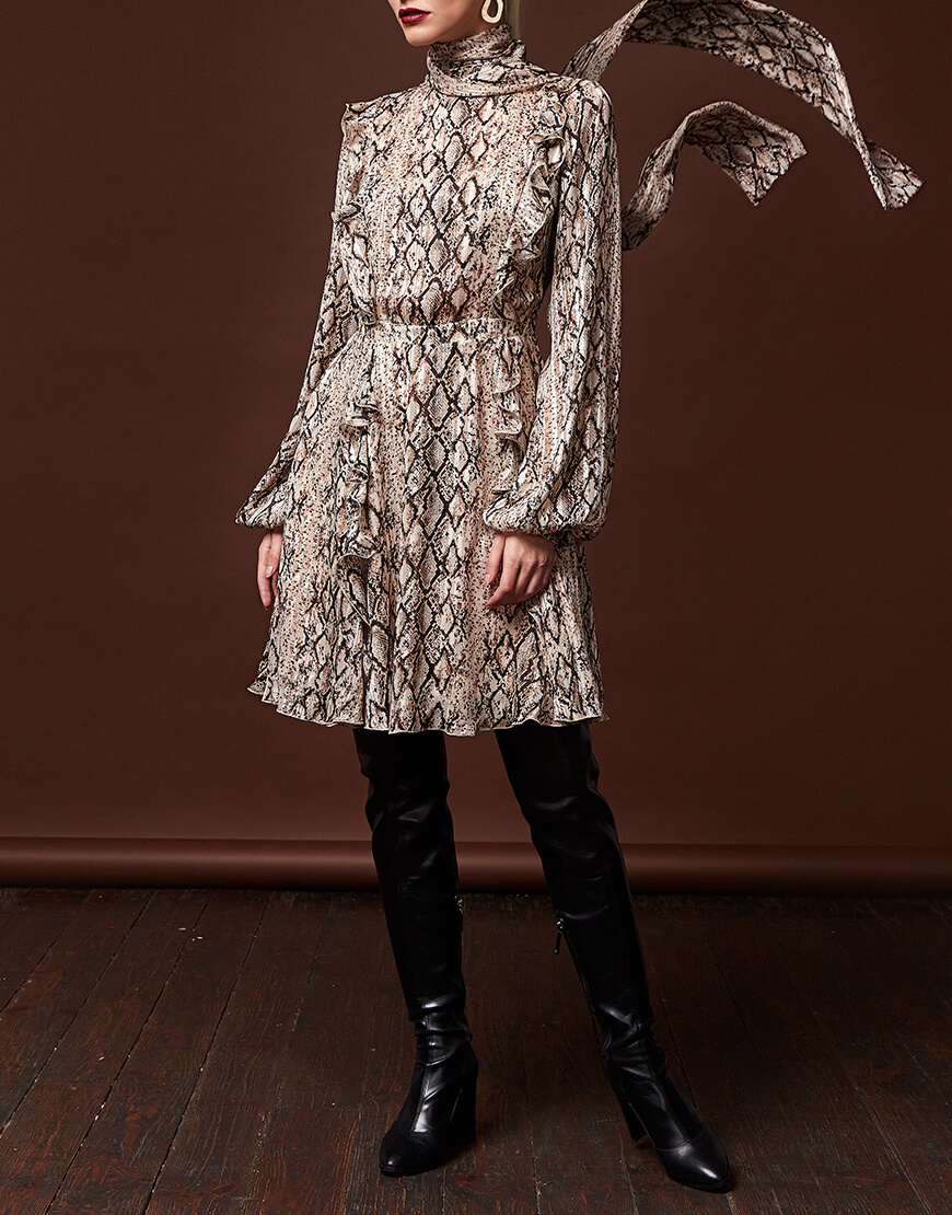 Легка, шифонова сукня в модному анімалістичному принті (пітон). Подвійна спідниця і легка тканина створюють силует, що неймовірно струминиться. Сукня застібається на таємну блискавку. Також спереду сукня зав’язується на бант.